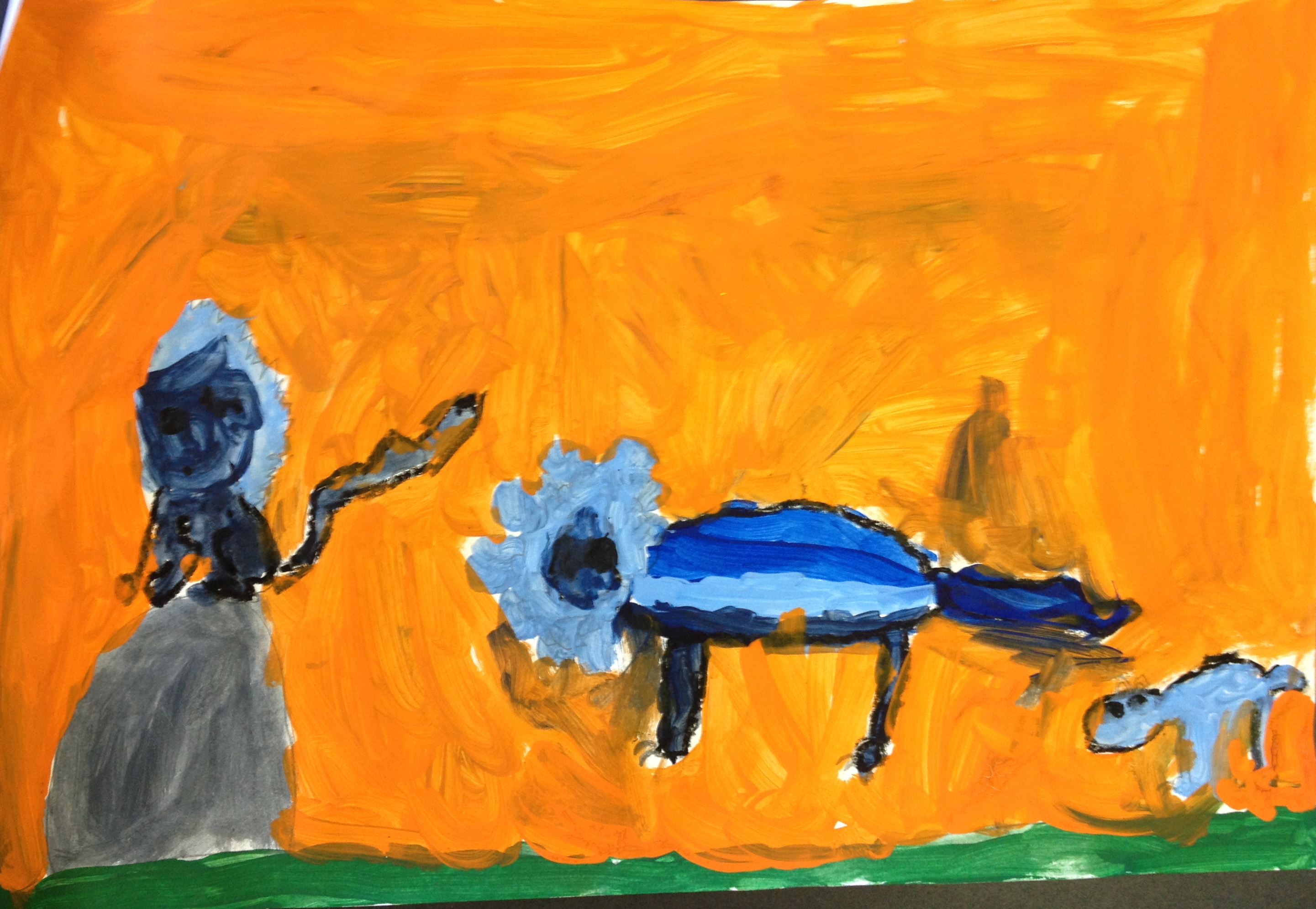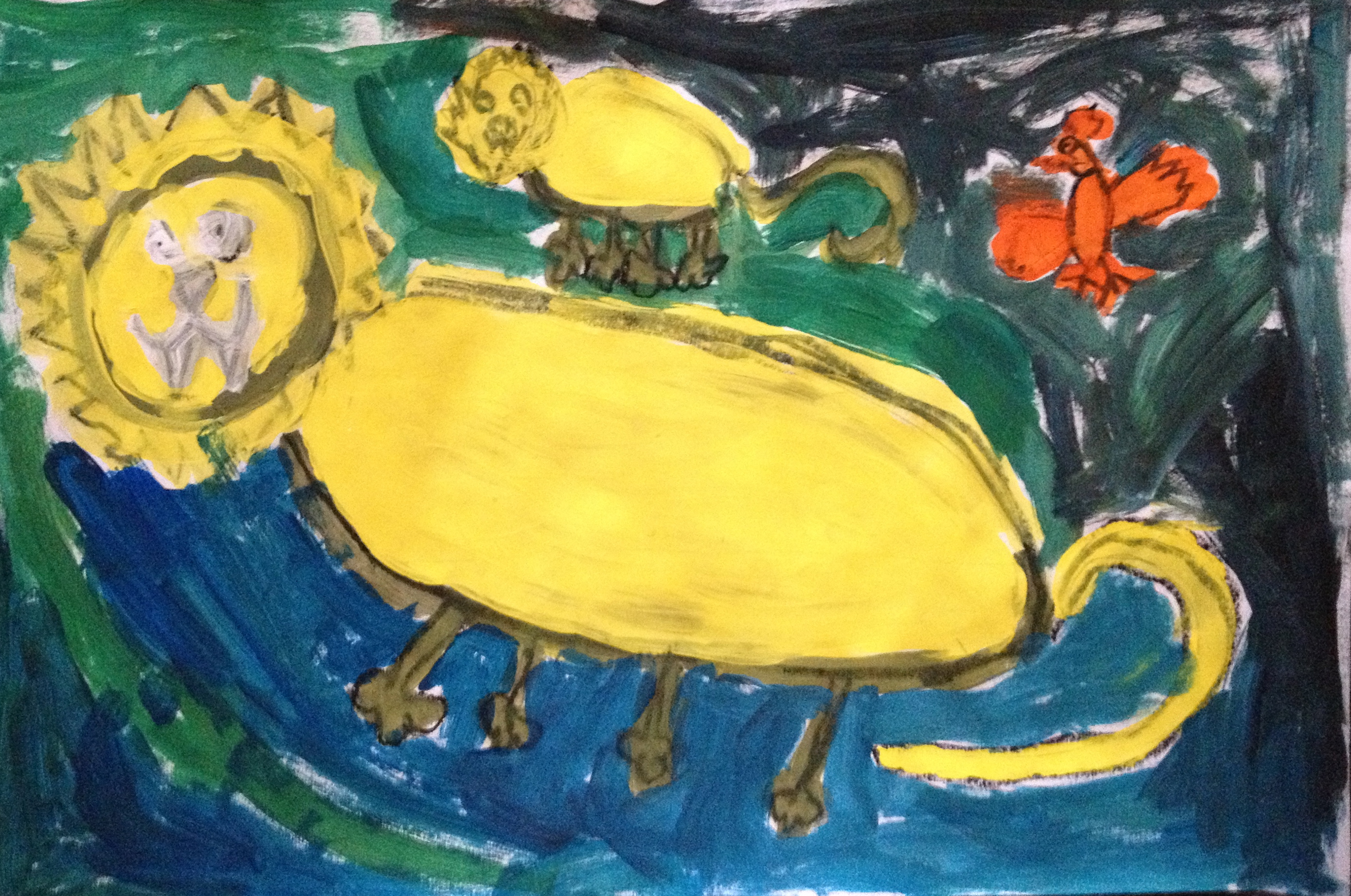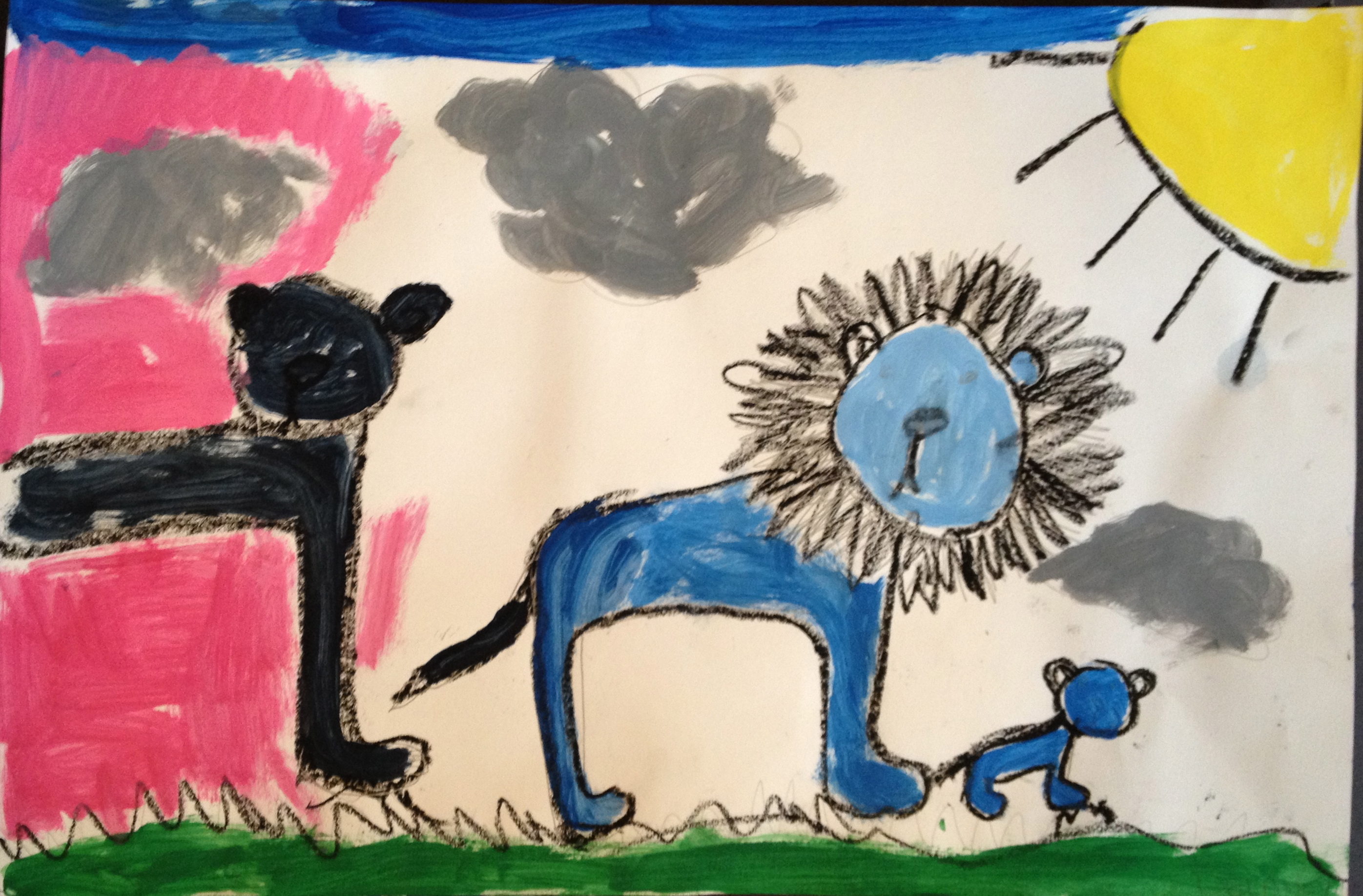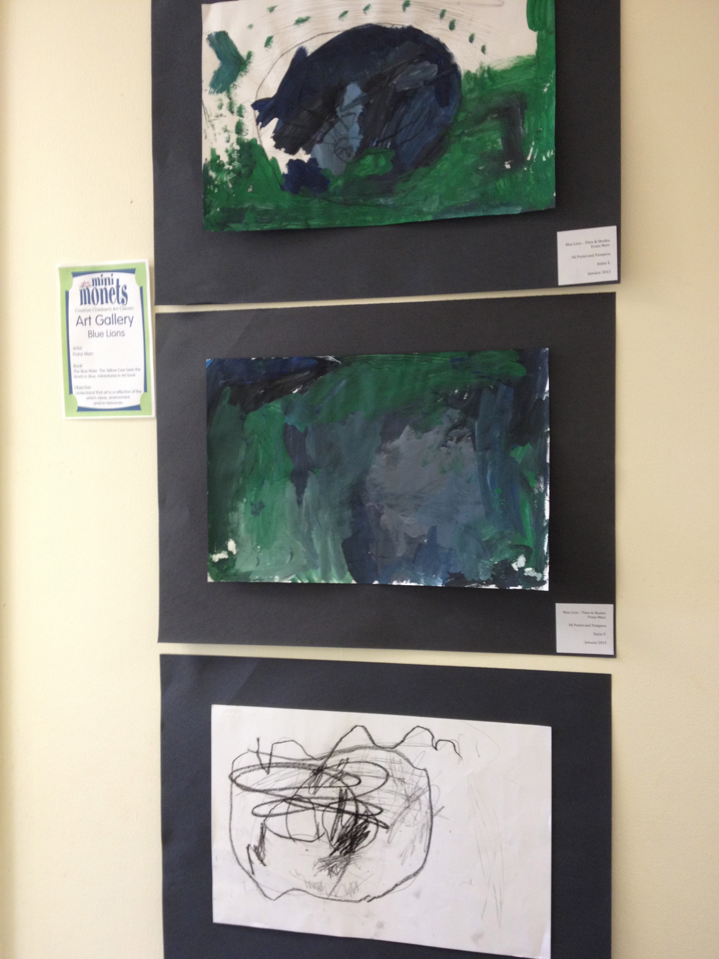 Over the last two months, we have looked at the paintings and still lifes of Realist/Impressionist Edouard Manet, the colorful horses of the Blue Rider’s Franz Marc, and the surrealistic memories of Marc Chagall. Our students learned about tertiary colors while painting the yellow-greens of bananas, apples, and pears in their own still lifes. Instead of horses like Franz Marc, I thought it would be fun to give some lions personality in our paintings. The artists were given blue, white, and black to paint them while learning that a color+white is called a tint and a color+black is a shade. I let their memories and imaginations soar after viewing Marc Chagall’s “I and the Village.” This is a personal favorite of mine and I loved sharing it with the young artists. Every child’s paintings were so different with a special moment illustrated in their tempera painting. Enjoy!IMG_0490