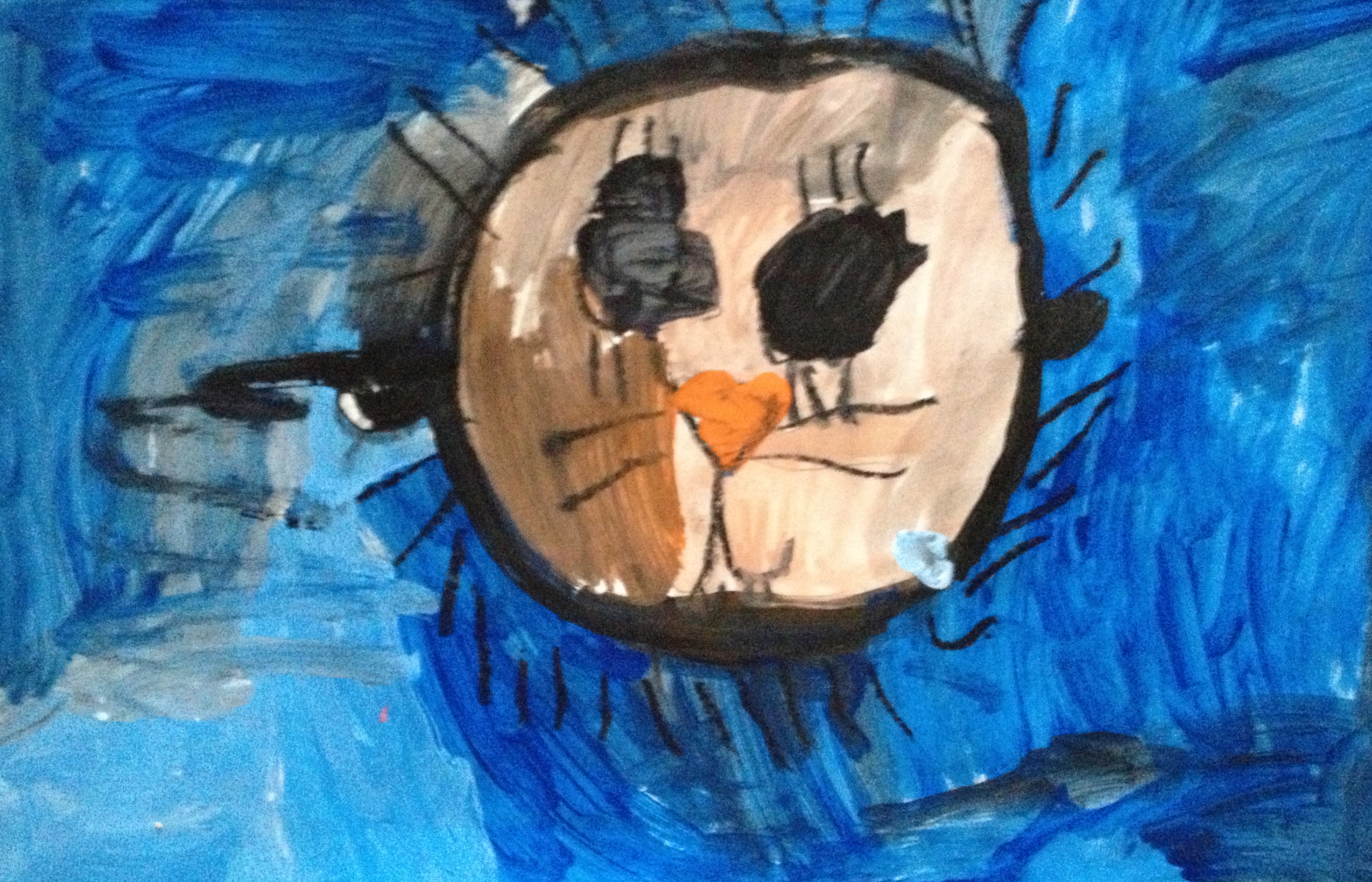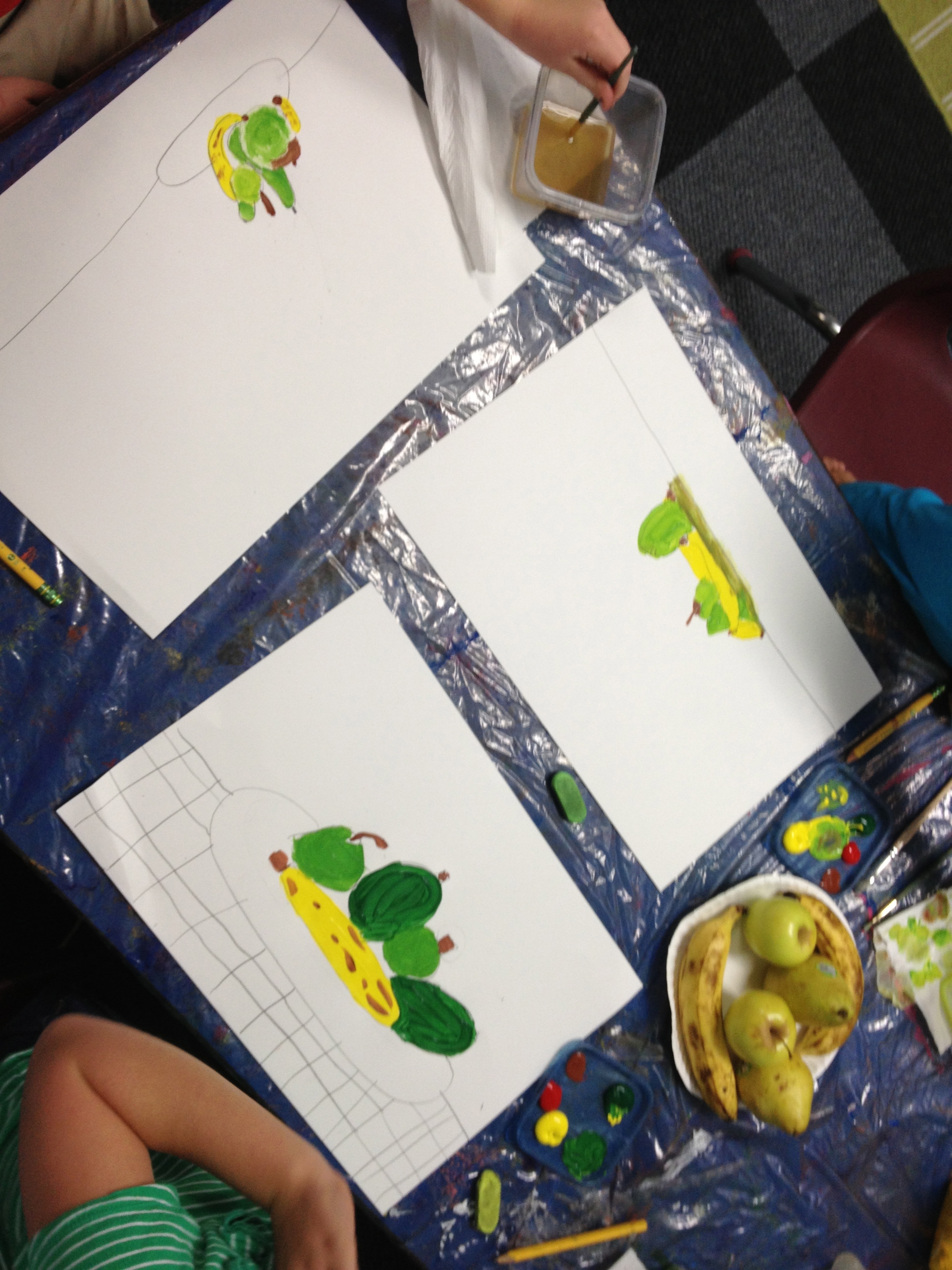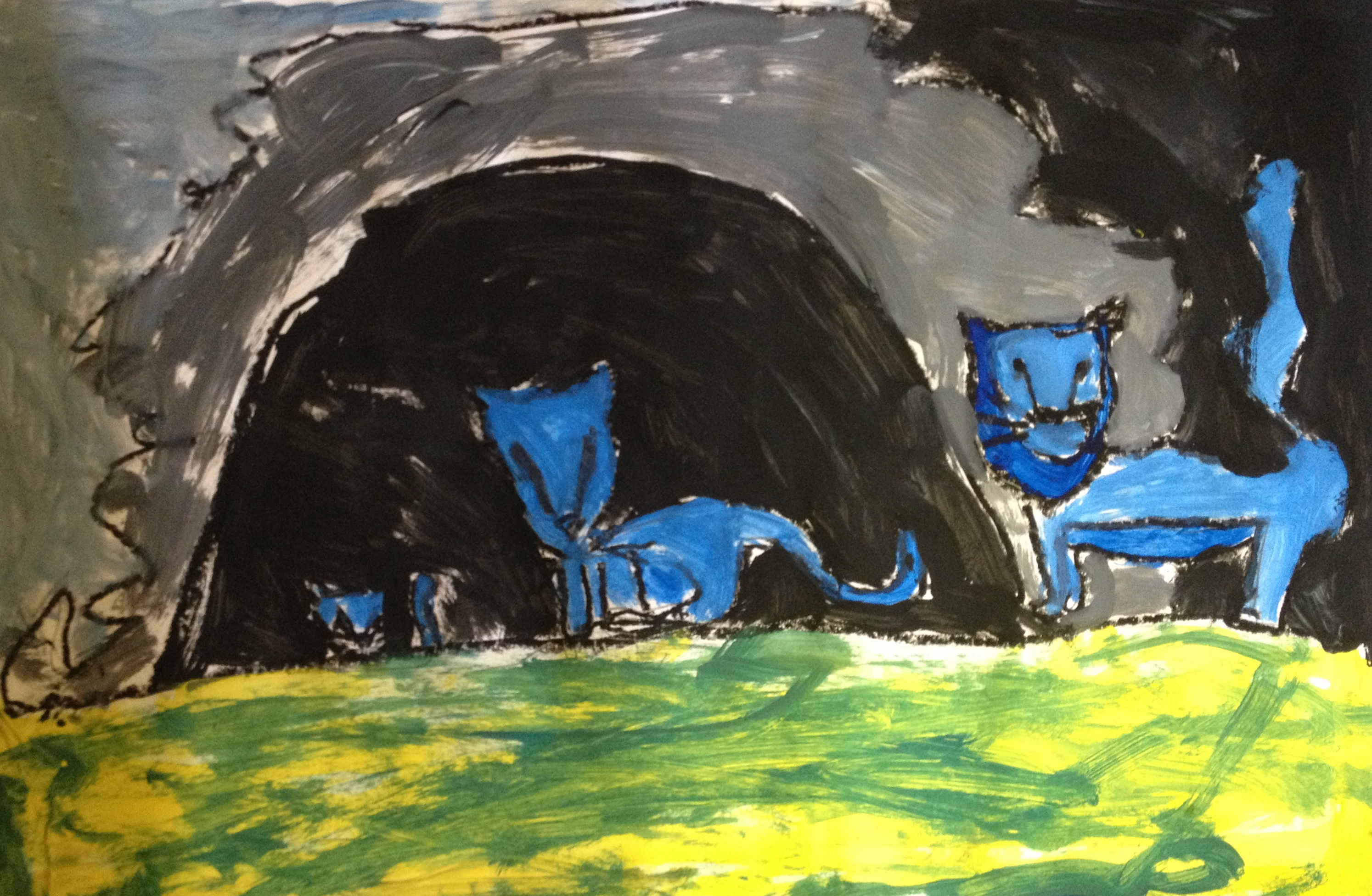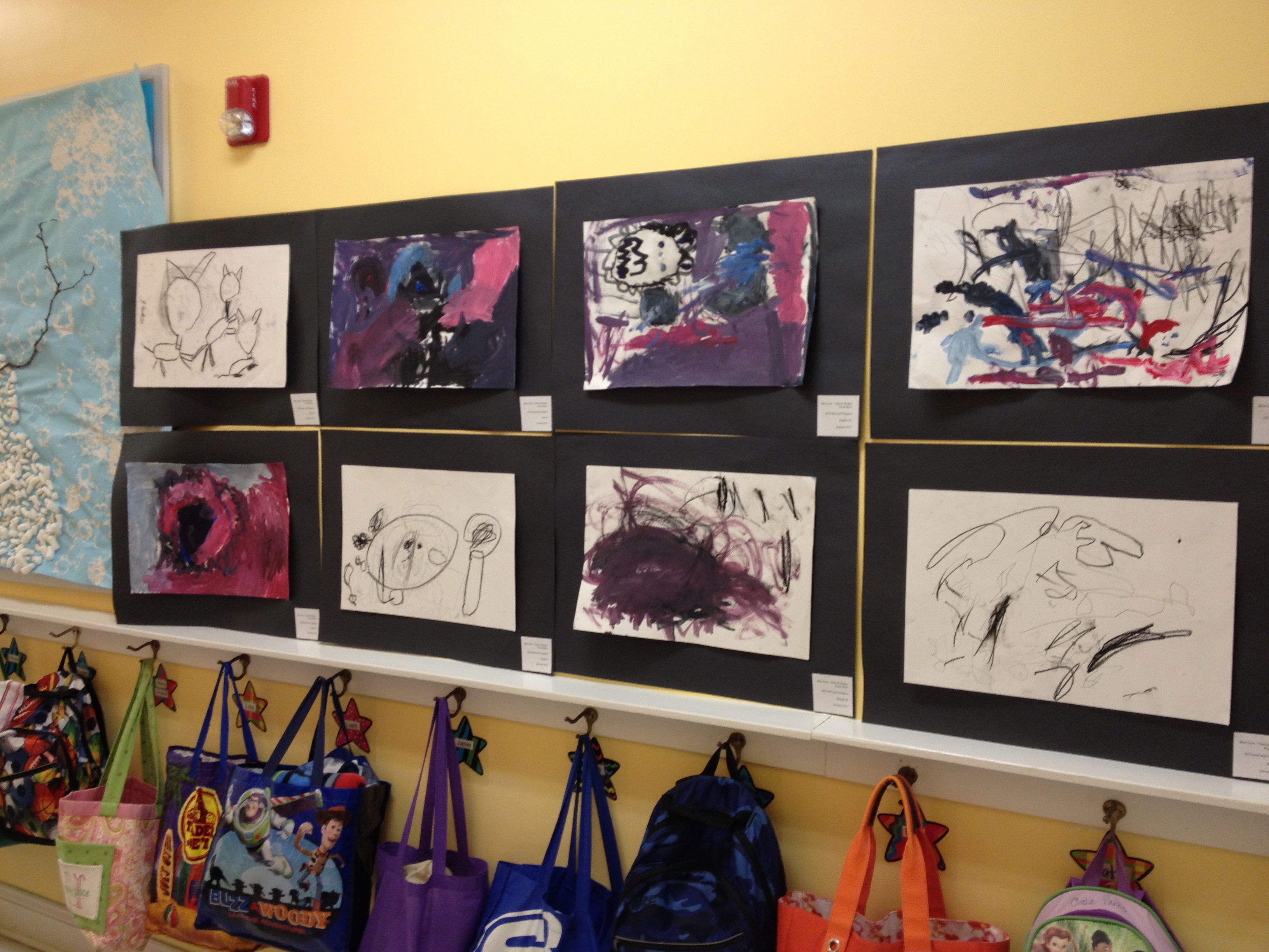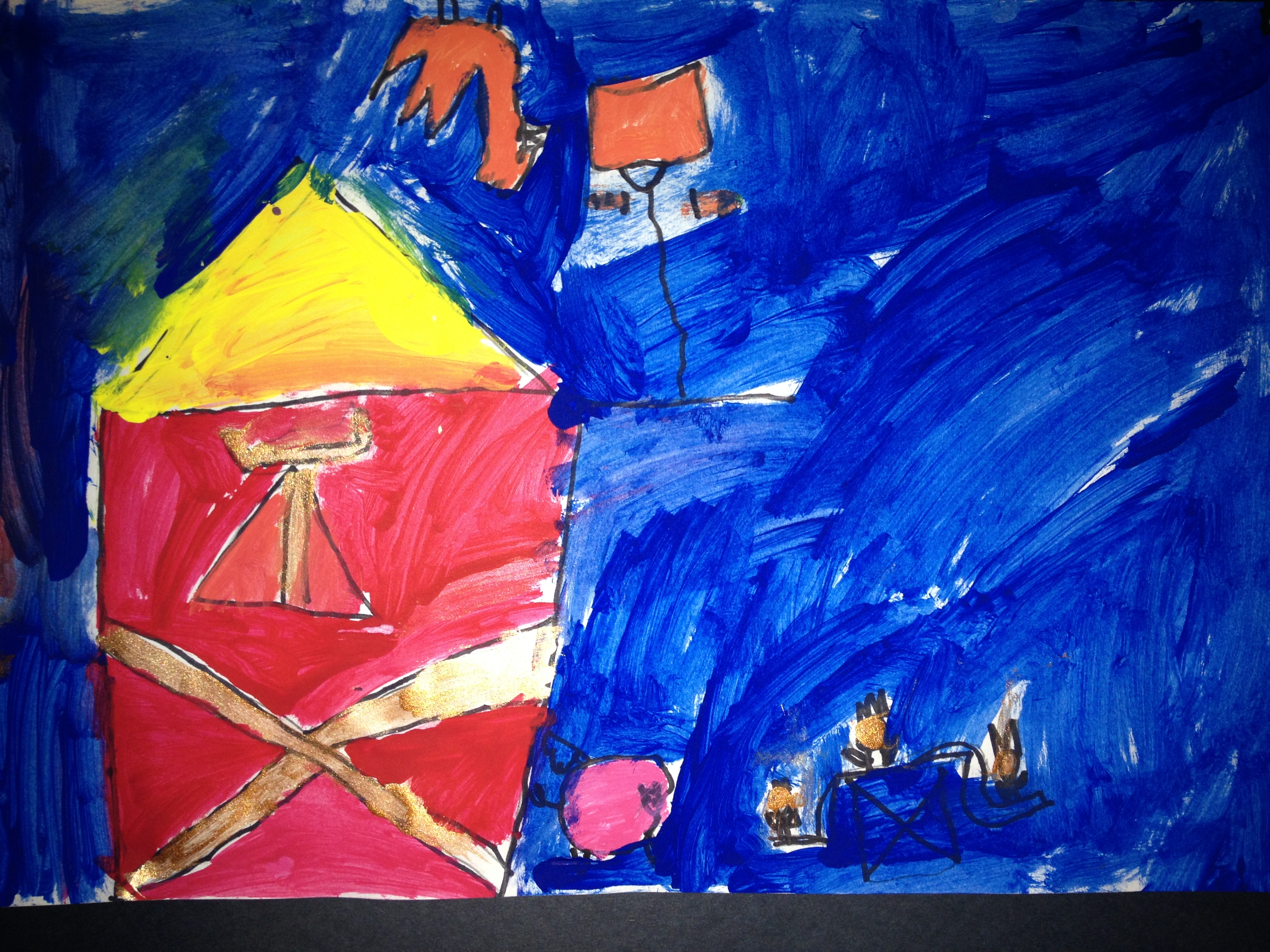 Over the last two months, we have looked at the paintings and still lifes of Realist/Impressionist Edouard Manet, the colorful horses of the Blue Rider’s Franz Marc, and the surrealistic memories of Marc Chagall. Our students learned about tertiary colors while painting the yellow-greens of bananas, apples, and pears in their own still lifes. Instead of horses like Franz Marc, I thought it would be fun to give some lions personality in our paintings. The artists were given blue, white, and black to paint them while learning that a color+white is called a tint and a color+black is a shade. I let their memories and imaginations soar after viewing Marc Chagall’s “I and the Village.” This is a personal favorite of mine and I loved sharing it with the young artists. Every child’s paintings were so different with a special moment illustrated in their tempera painting. Enjoy!IMG_0490