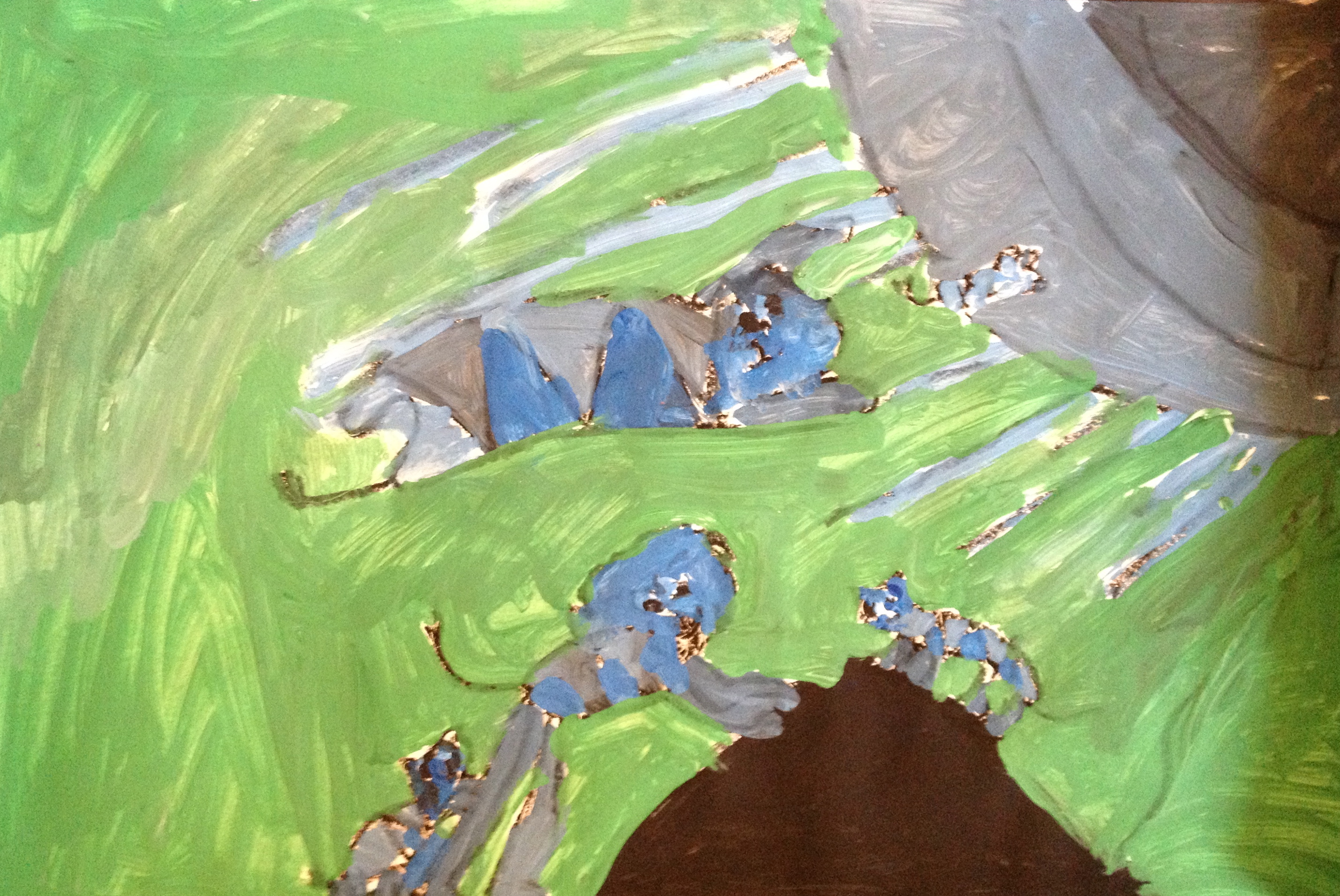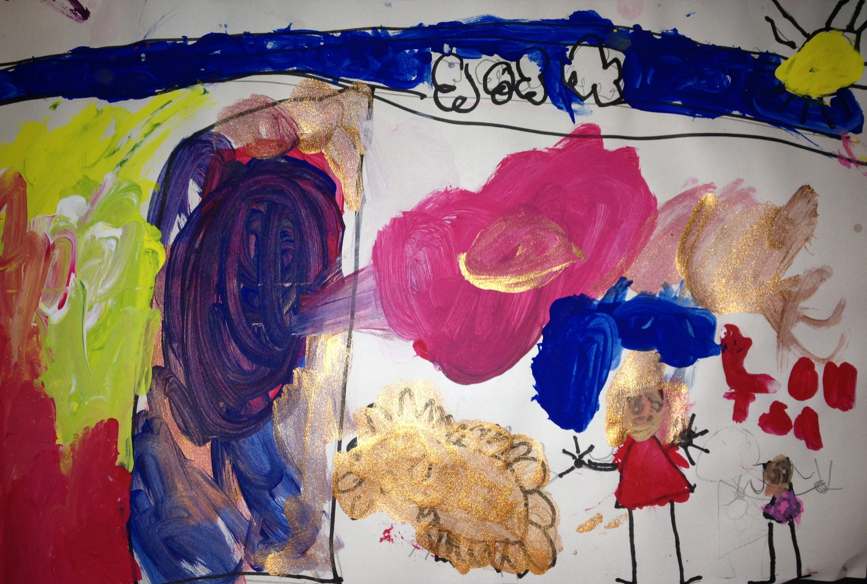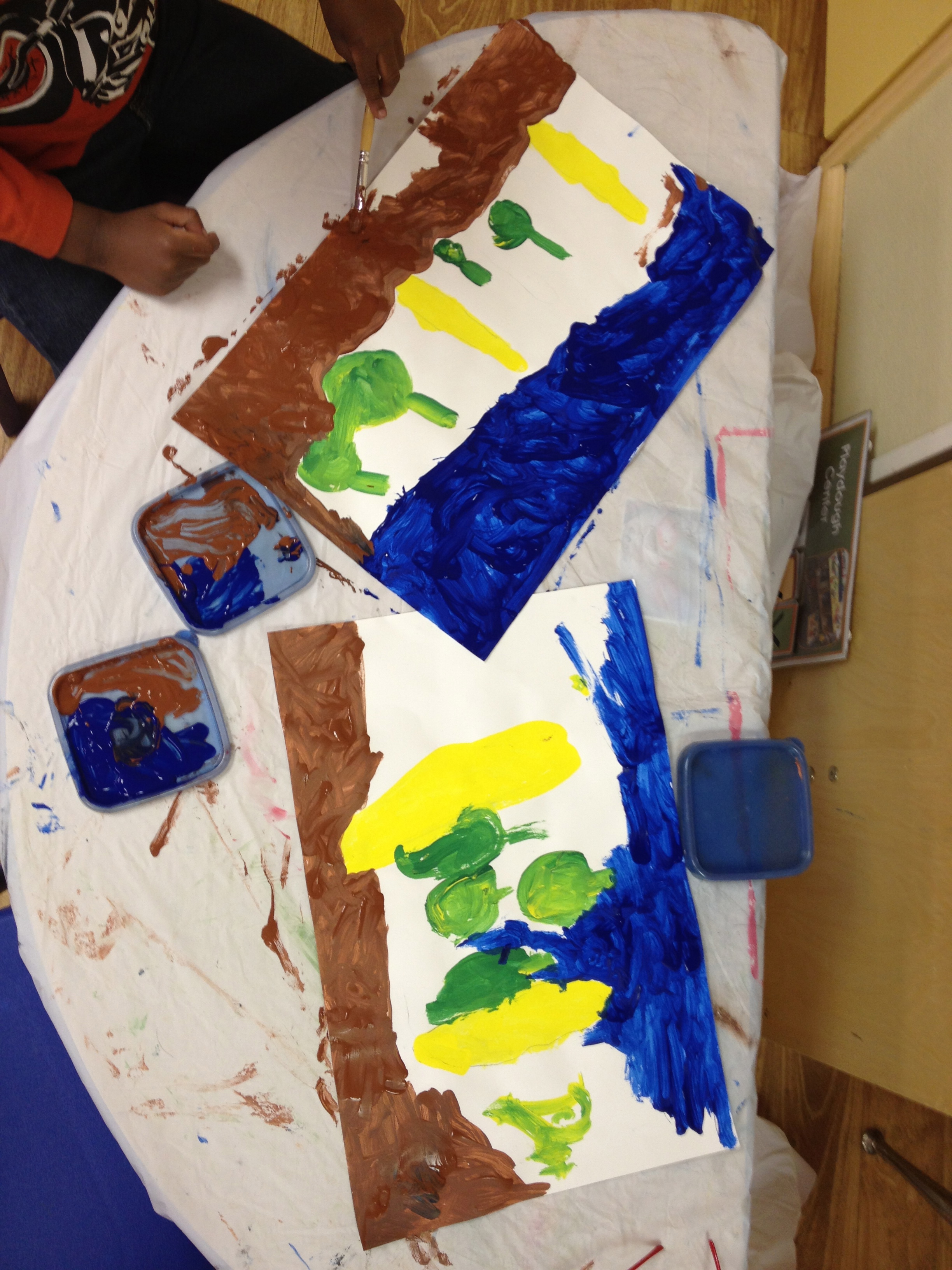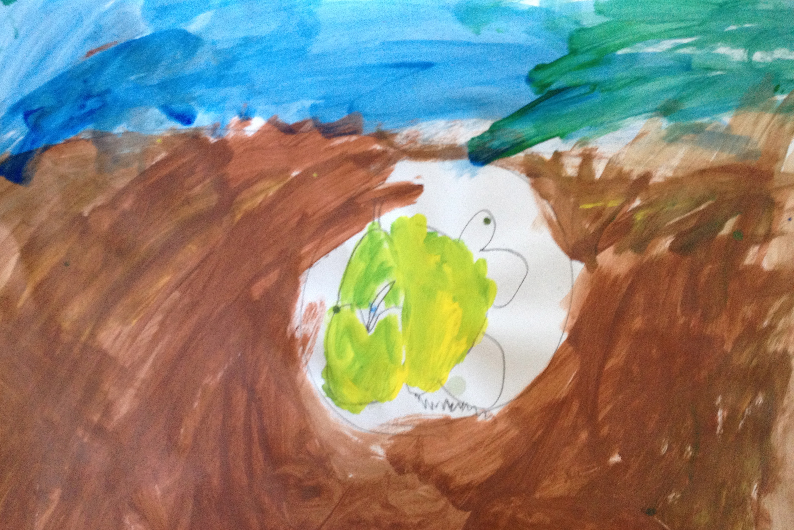 Over the last two months, we have looked at the paintings and still lifes of Realist/Impressionist Edouard Manet, the colorful horses of the Blue Rider’s Franz Marc, and the surrealistic memories of Marc Chagall. Our students learned about tertiary colors while painting the yellow-greens of bananas, apples, and pears in their own still lifes. Instead of horses like Franz Marc, I thought it would be fun to give some lions personality in our paintings. The artists were given blue, white, and black to paint them while learning that a color+white is called a tint and a color+black is a shade. I let their memories and imaginations soar after viewing Marc Chagall’s “I and the Village.” This is a personal favorite of mine and I loved sharing it with the young artists. Every child’s paintings were so different with a special moment illustrated in their tempera painting. Enjoy!IMG_0490