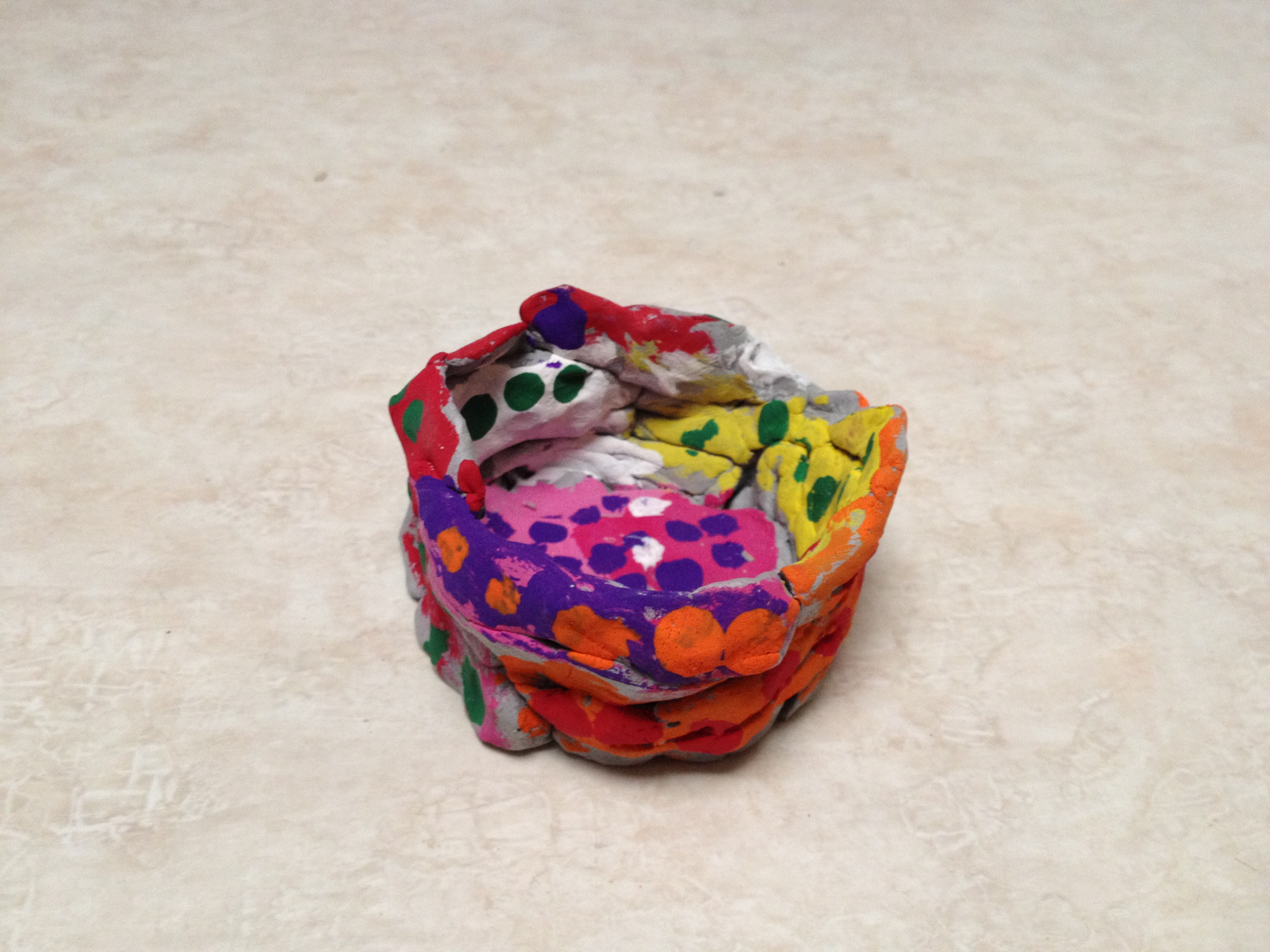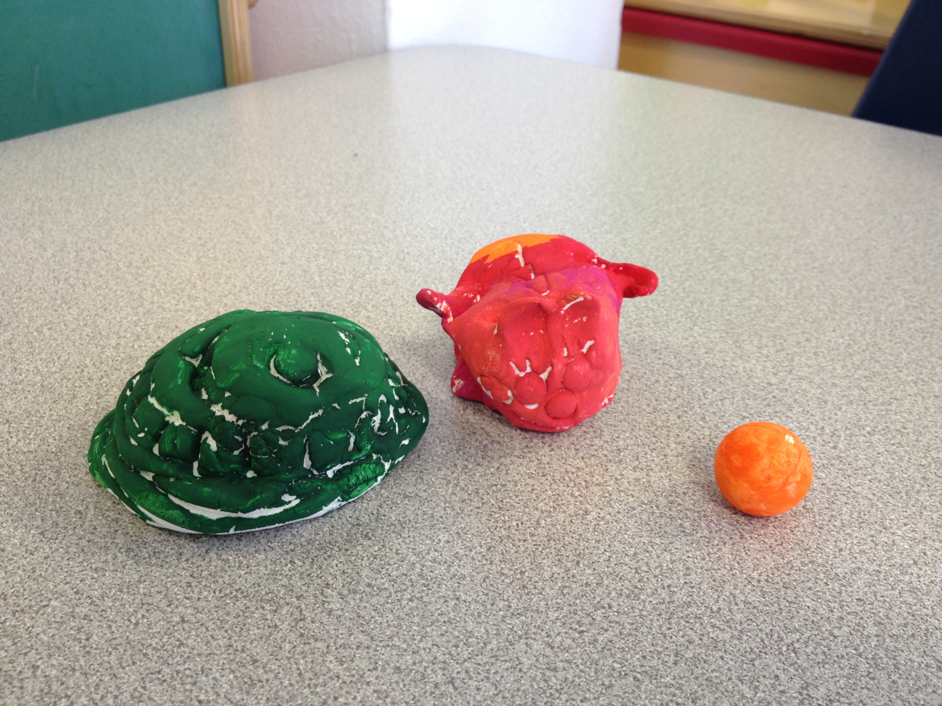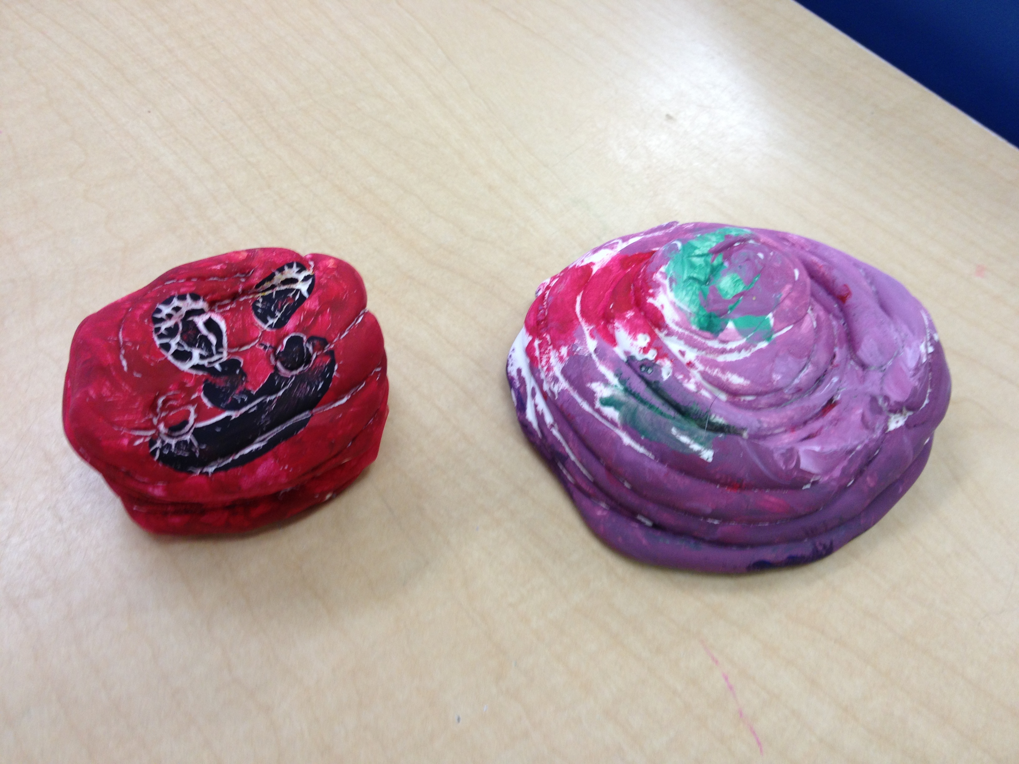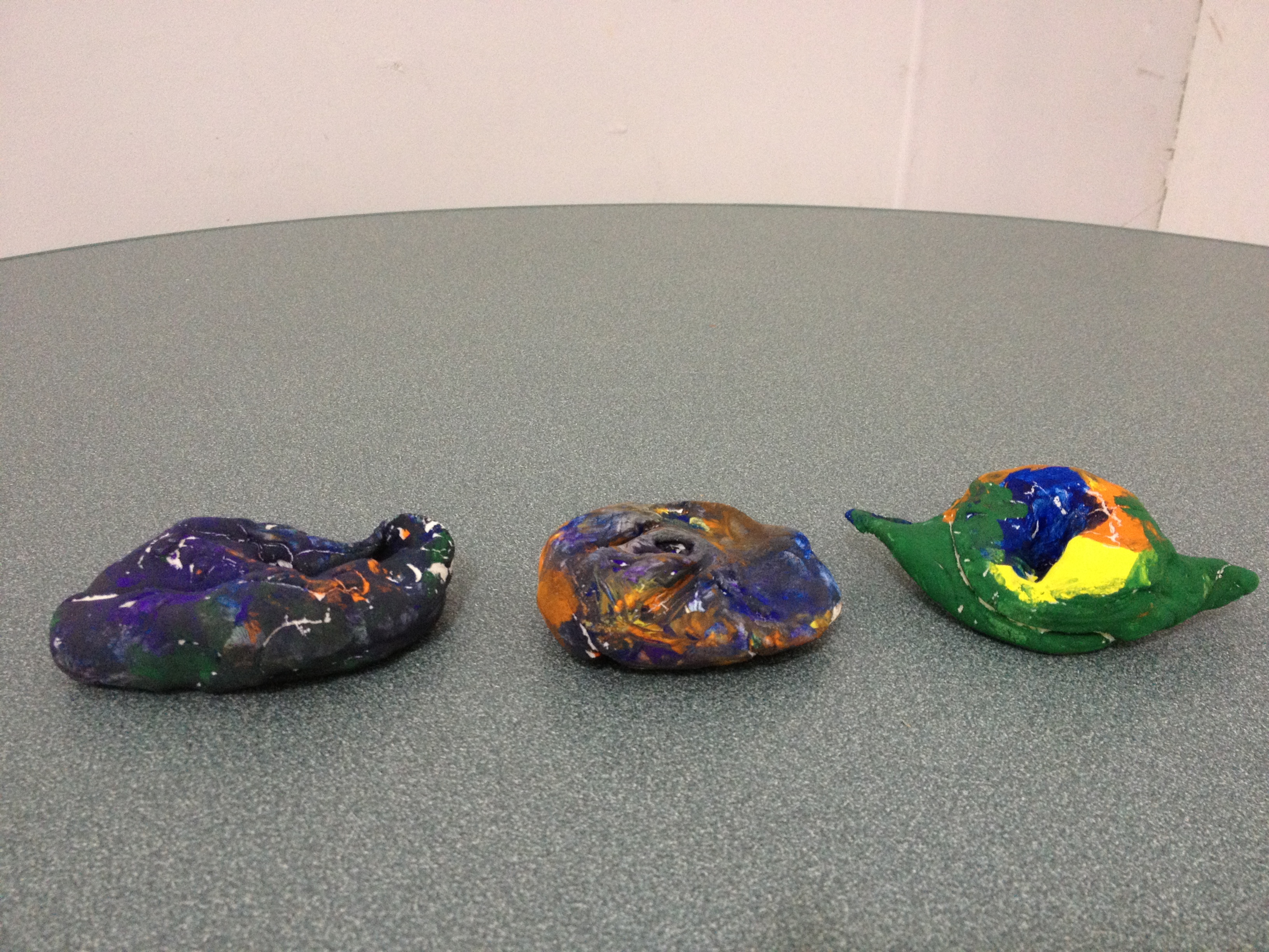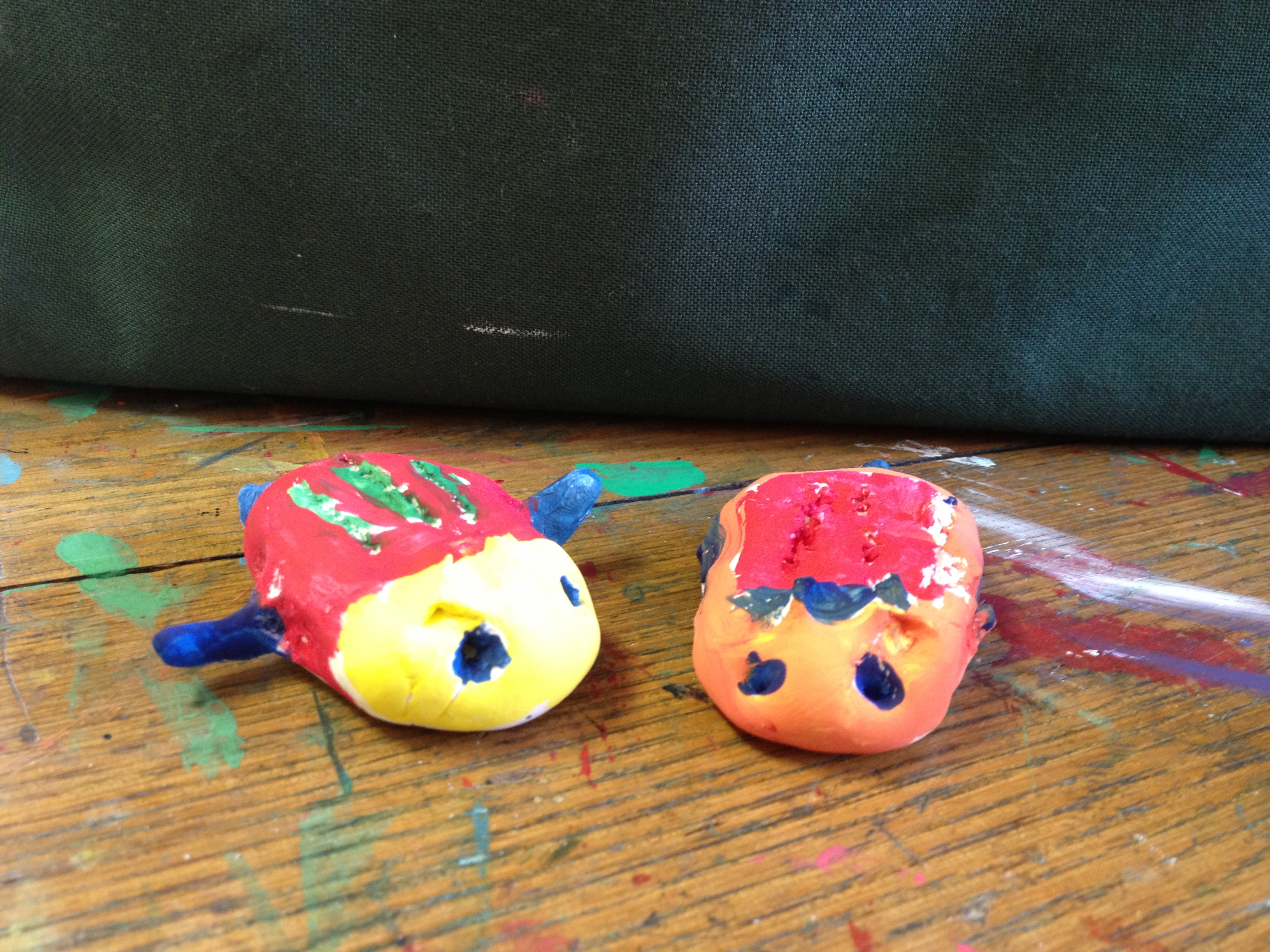 For our first projects in clay, I like to introduce the basics. Manipulation of clay starts with the basic pinch and pull. You can stretch out legs or pinch out wings. From there, clay can be twisted and turned to make any simple creature. Last year, we made Penguins and Igloos and I wanted to keep the project so that we could learn about a different animal and their habitat. So we created bees and bee hives. The bees started out as a simple pinch pot, then we flipped the pot over and pinched out wings, antennae, legs, and stingers. The bee hive was made by flipping a coil pot upside down. Creating a coil pot teaches artists how to roll a coil, a snake like shape, that is bent into a ring and stacked upon other coils. To seal the stack, each coil must be scored, or roughened with a tool, and a thin layer of water, called slip, must be applied to the rough area. After placing a new coil, they must be blended together using fingers or tools to create a stronger bond. To finish each piece, the artists were able to choose four colors and their imaginations went wild when they didn’t have to paint black and white bees.