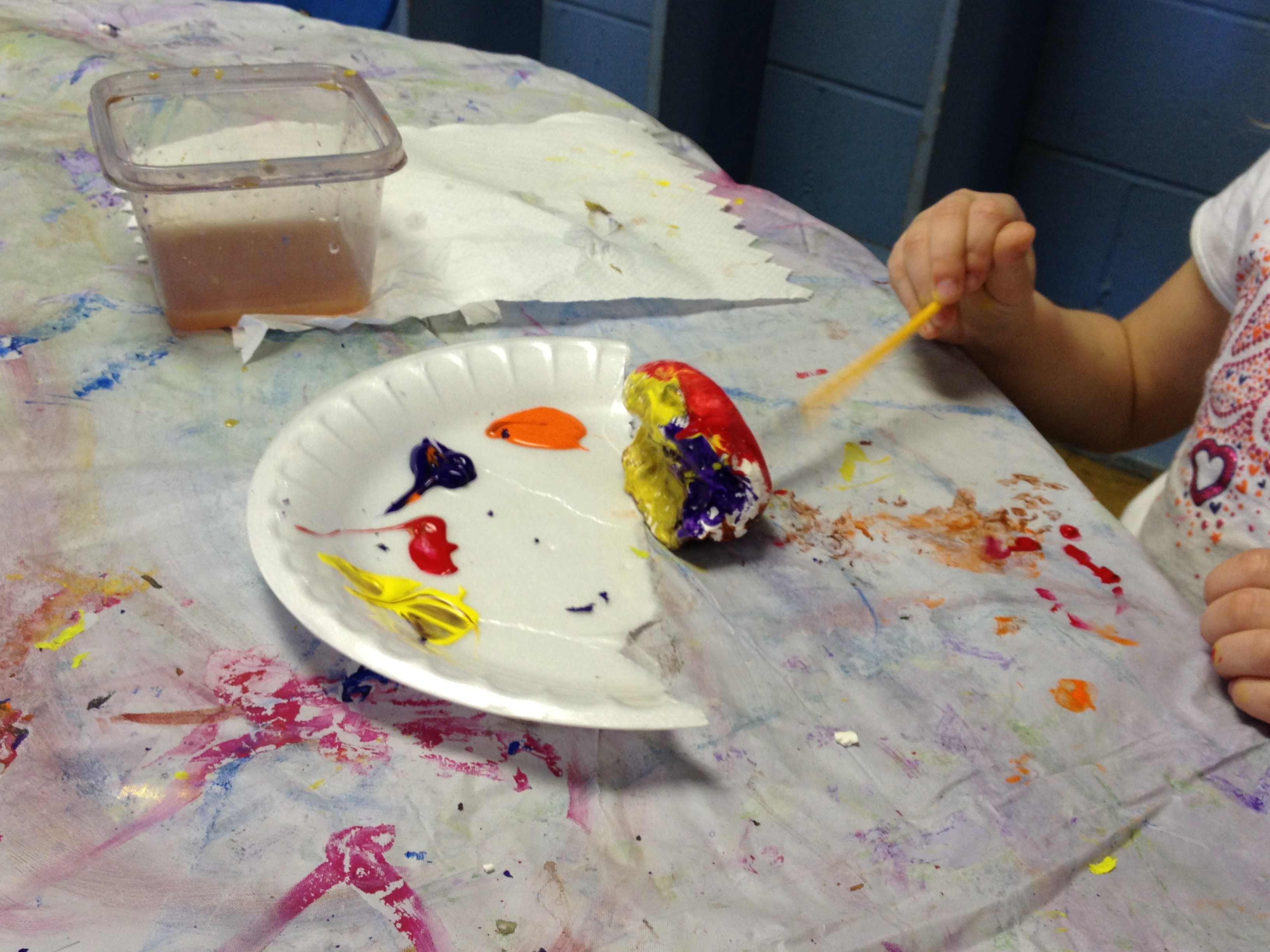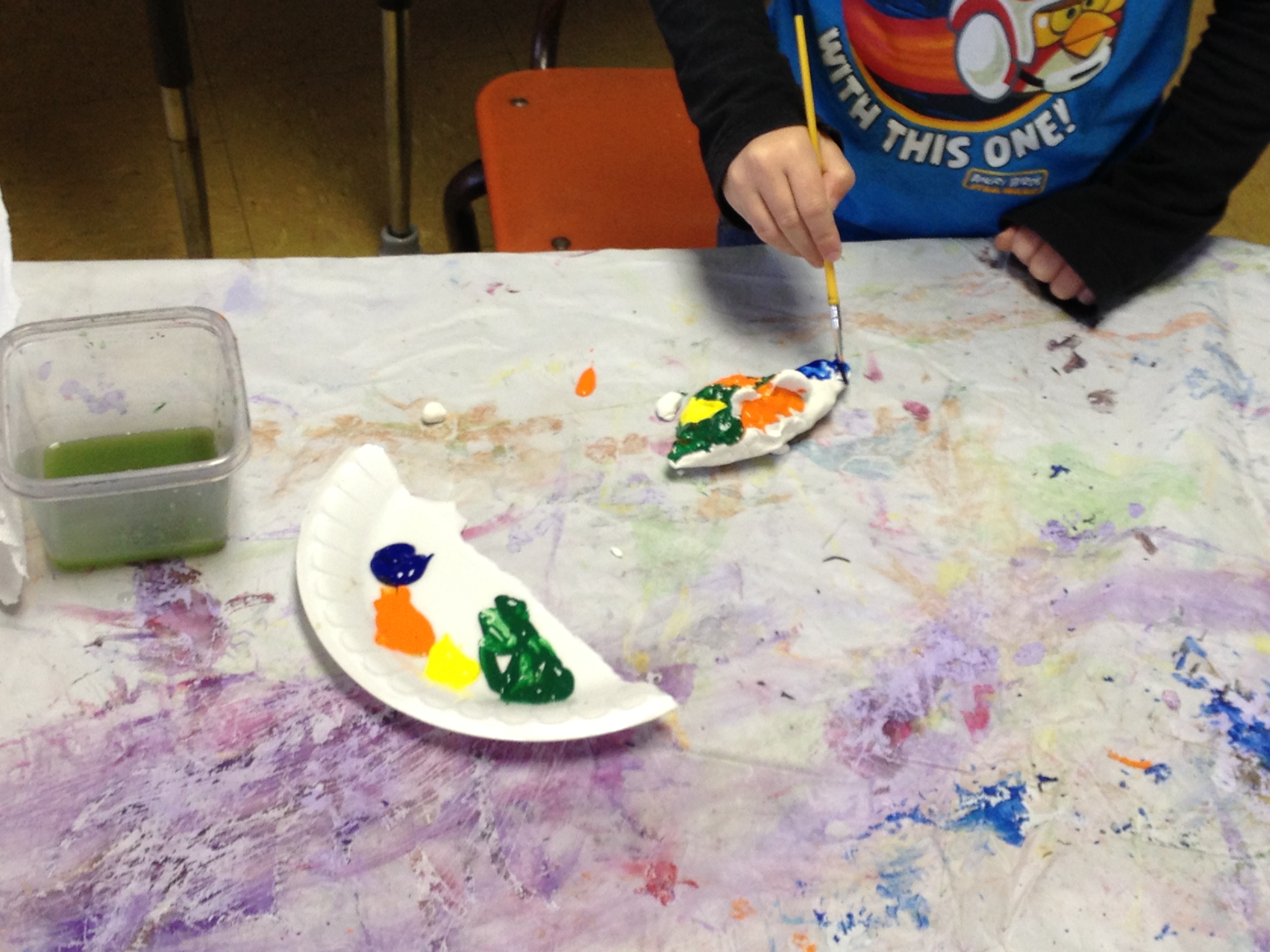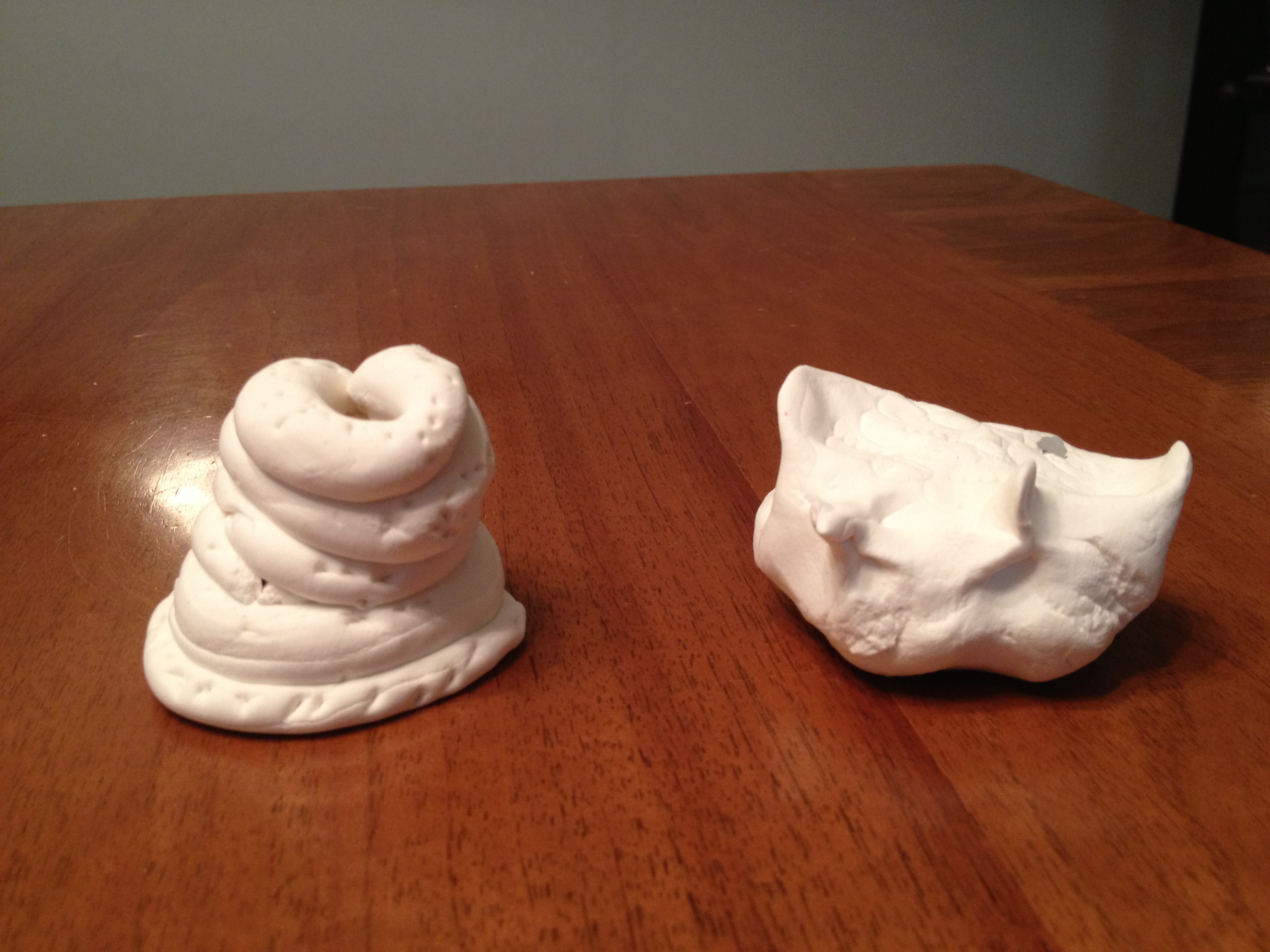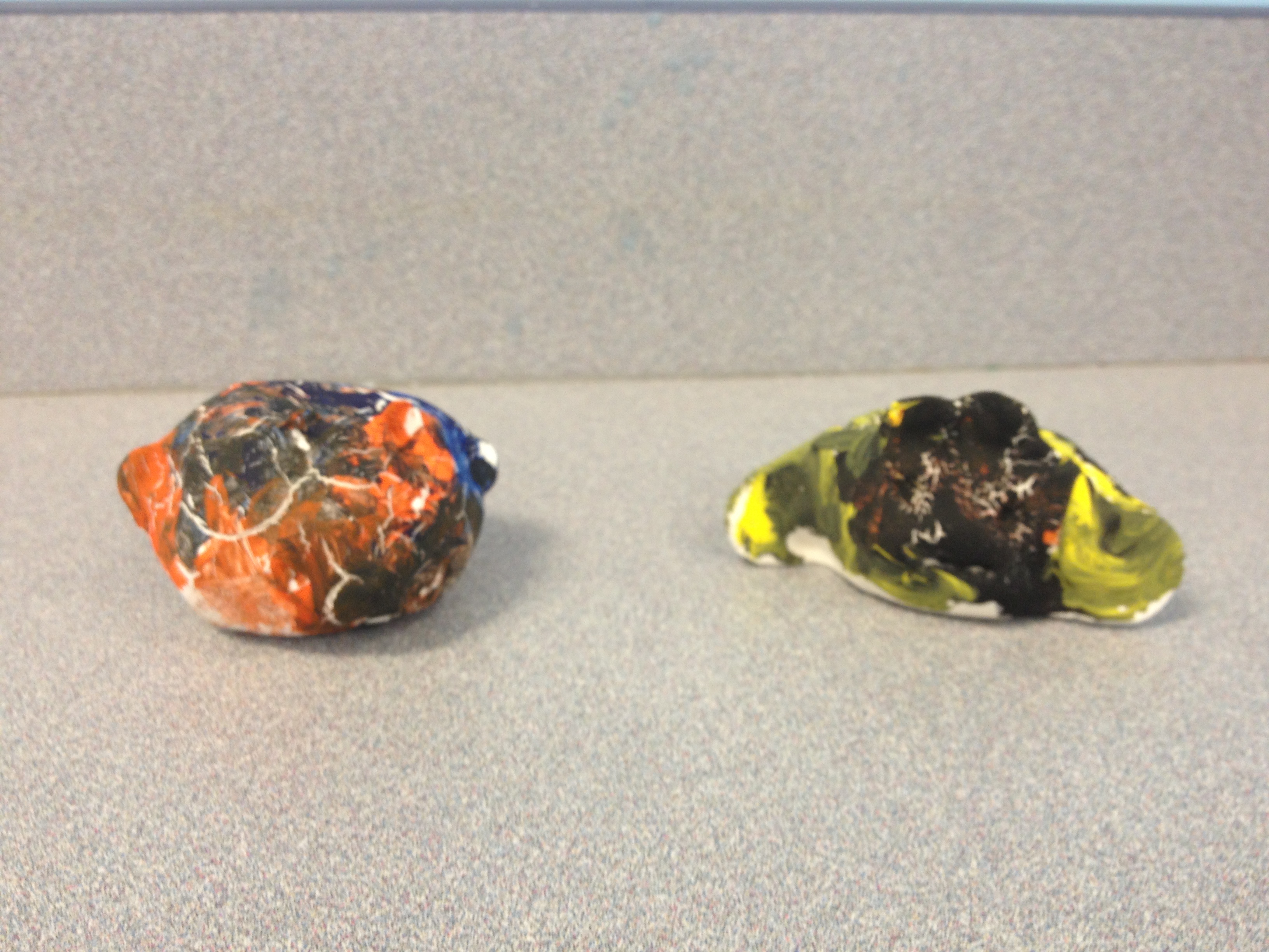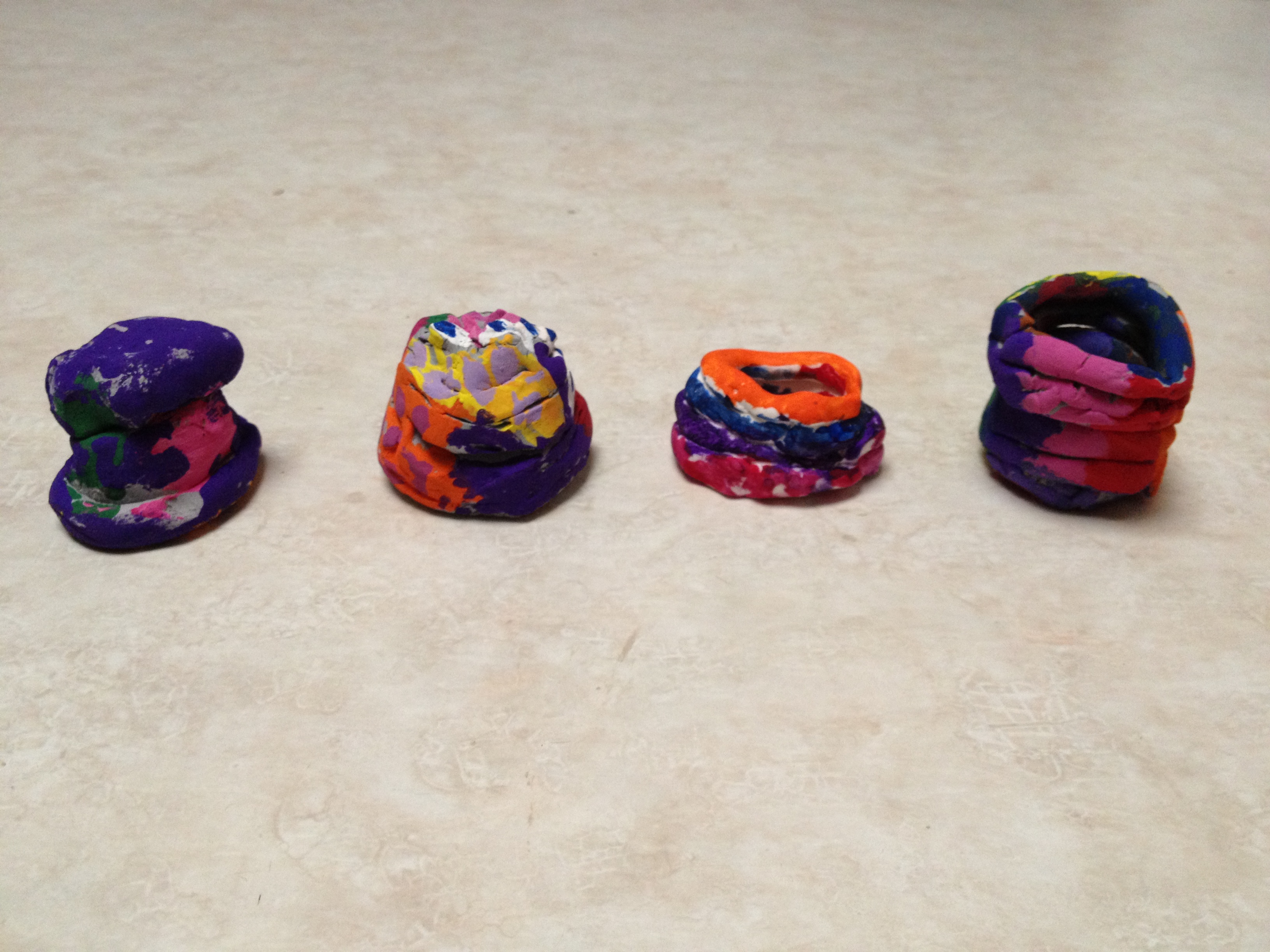 For our first projects in clay, I like to introduce the basics. Manipulation of clay starts with the basic pinch and pull. You can stretch out legs or pinch out wings. From there, clay can be twisted and turned to make any simple creature. Last year, we made Penguins and Igloos and I wanted to keep the project so that we could learn about a different animal and their habitat. So we created bees and bee hives. The bees started out as a simple pinch pot, then we flipped the pot over and pinched out wings, antennae, legs, and stingers. The bee hive was made by flipping a coil pot upside down. Creating a coil pot teaches artists how to roll a coil, a snake like shape, that is bent into a ring and stacked upon other coils. To seal the stack, each coil must be scored, or roughened with a tool, and a thin layer of water, called slip, must be applied to the rough area. After placing a new coil, they must be blended together using fingers or tools to create a stronger bond. To finish each piece, the artists were able to choose four colors and their imaginations went wild when they didn’t have to paint black and white bees.