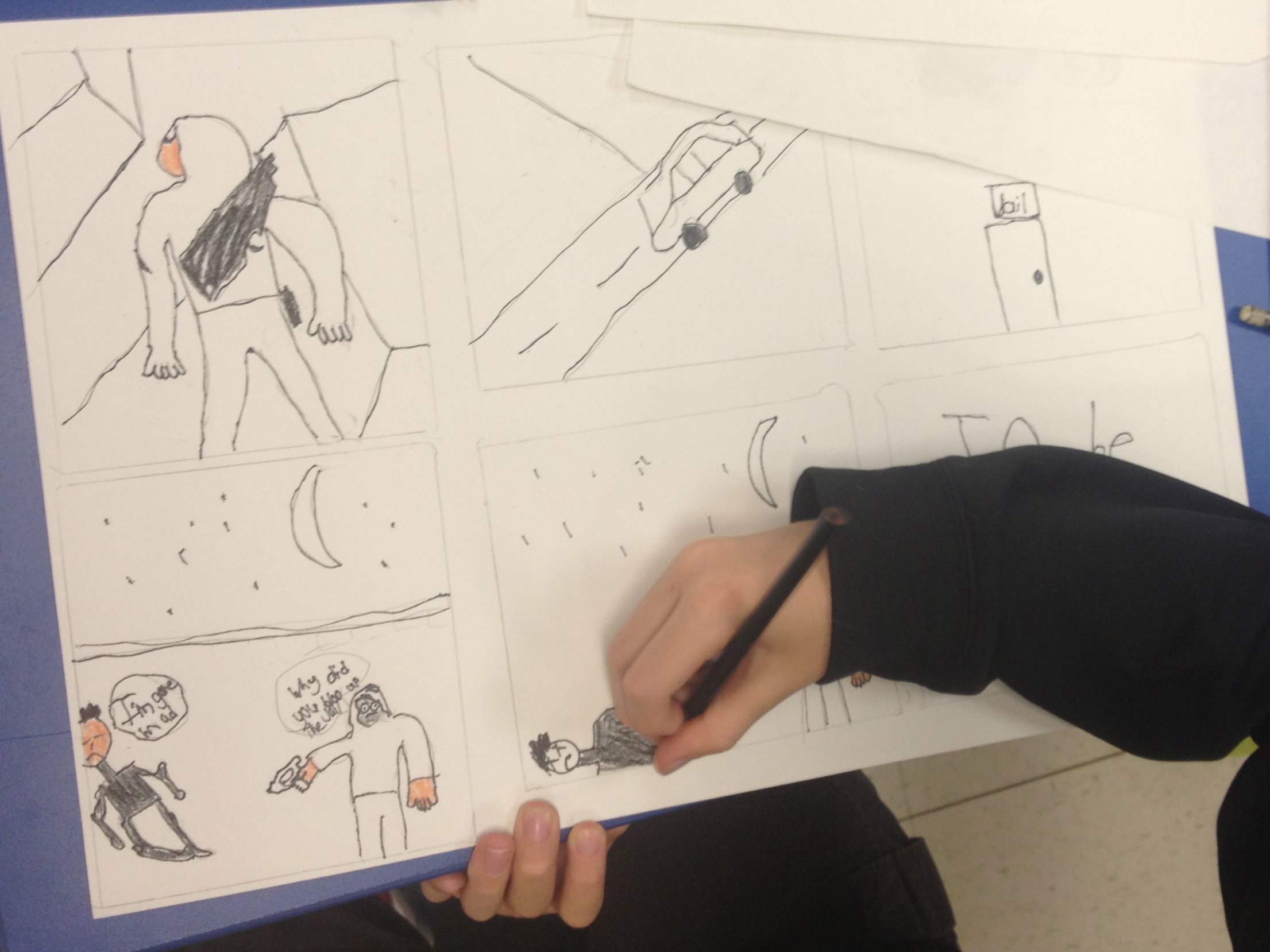 For my first group this summer, we started out the week listening to an old classic, The Shepherd and the Wolf by Aesop. It’s better known as the boy who cried wolf. The students created a number of shot cards to illustrate this story after learning about the different types of shots. The next day we traveled outside to draw on location while talking about the different layouts that are used in illustration. On Wednesday, they started to work on their own comic character and created a model sheet. They had the choice of a static model sheet, which has the character rotate 360 in one pose. The other option was to have the character in dynamic poses, with lots of action and movement. The final project was to create a 6 panel comic that was inked and colored. Enjoy the little bit of pictures I was able to take during this busy camp!