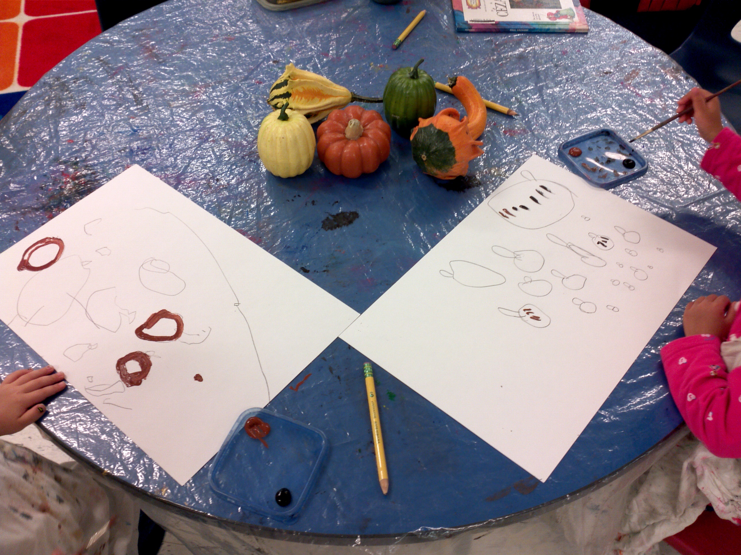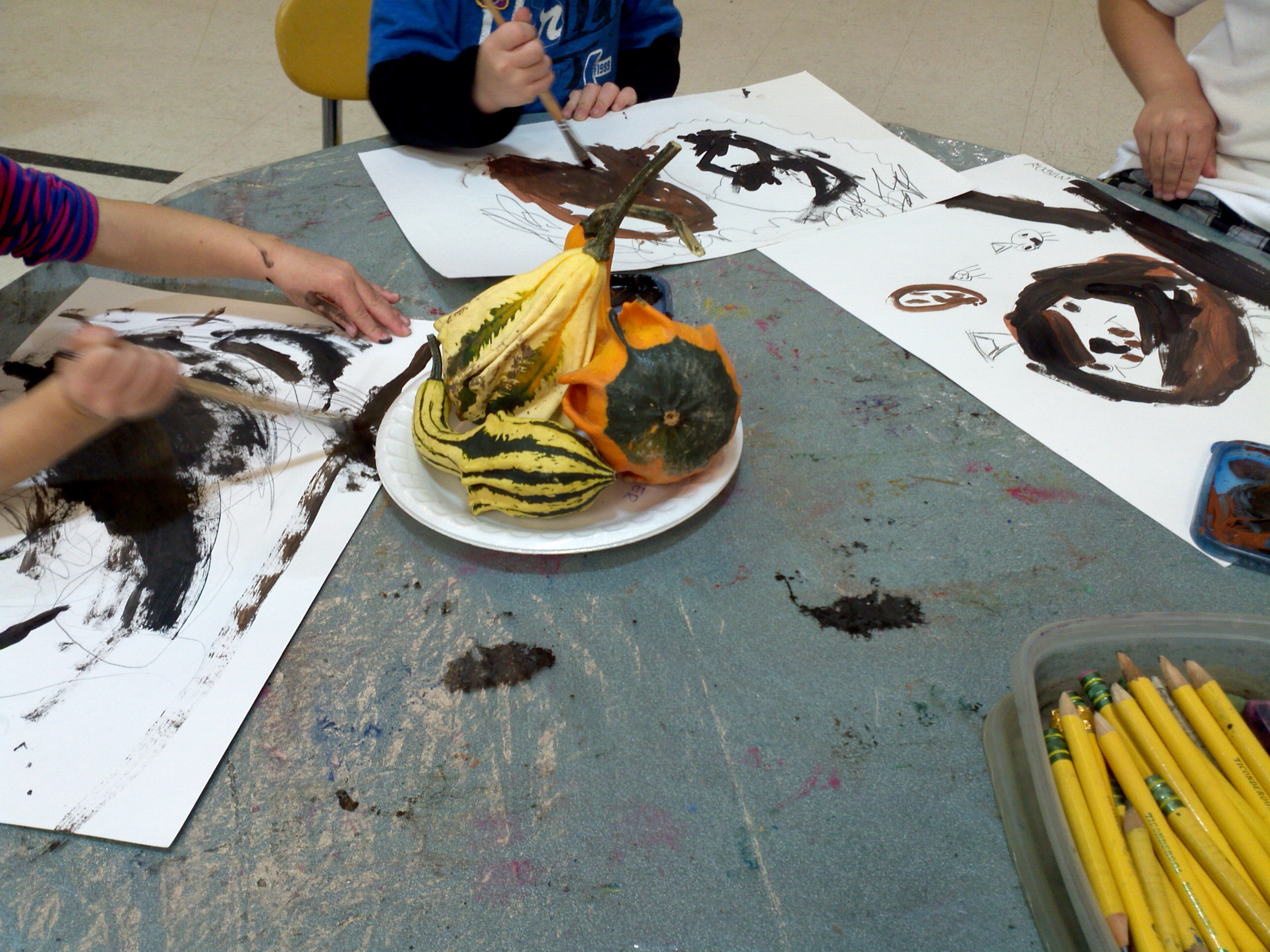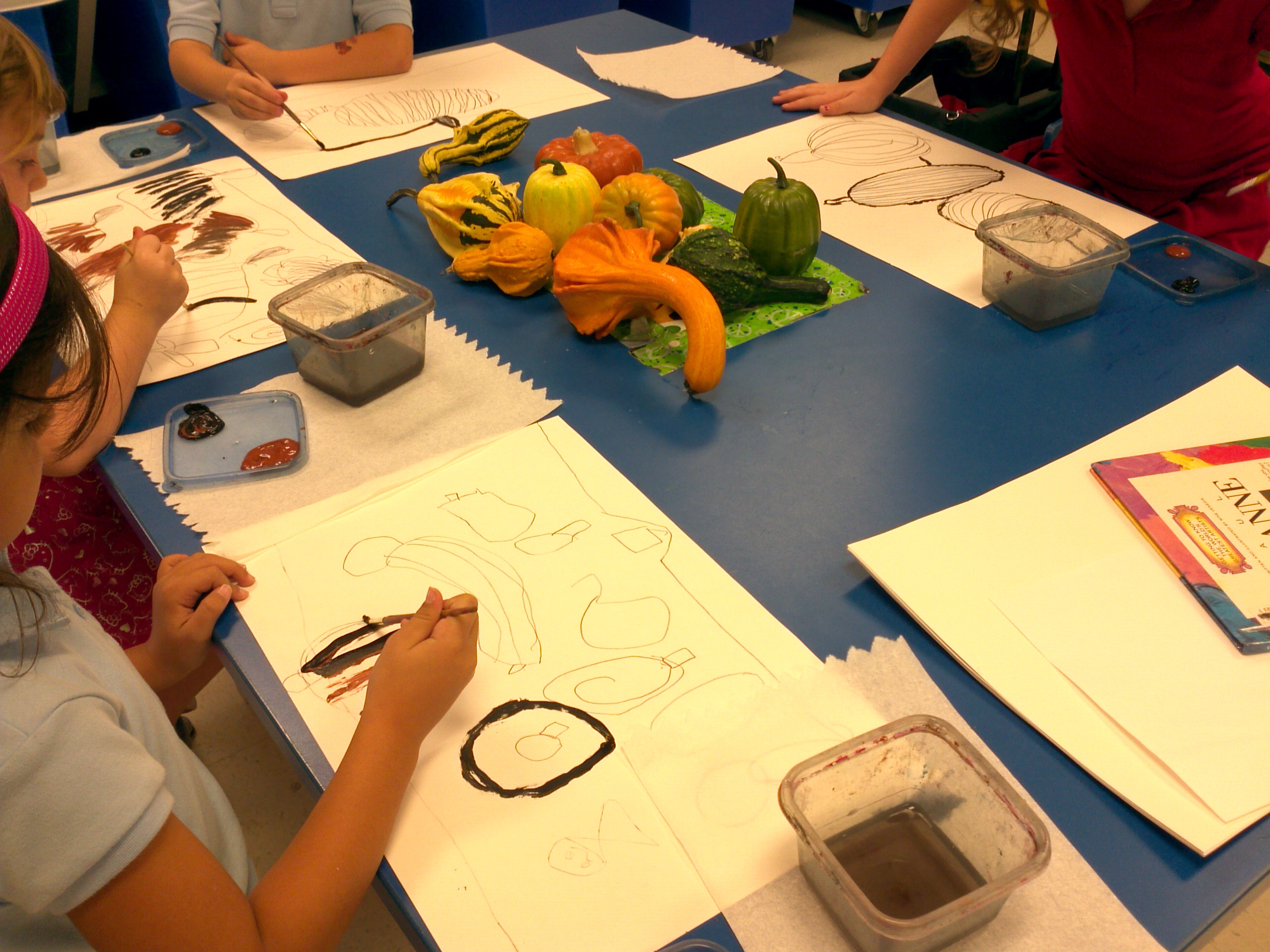 After reading some of the book, I let each student hold the pumpkins and gourds before setting them in the middle of the table. We talked about the round shapes of pumpkins and gourds. I demonstrated that when you are drawing a still life, the artists should draw the pumpkin that is closest to you, and then work your way to the farthest. After we drew all the pumpkins, we added a table line across the page so that the pumpkins would not be floating on the paper. After drawing, each artist was given black and brown tempera paint to create dark outlines on their still lifes.
