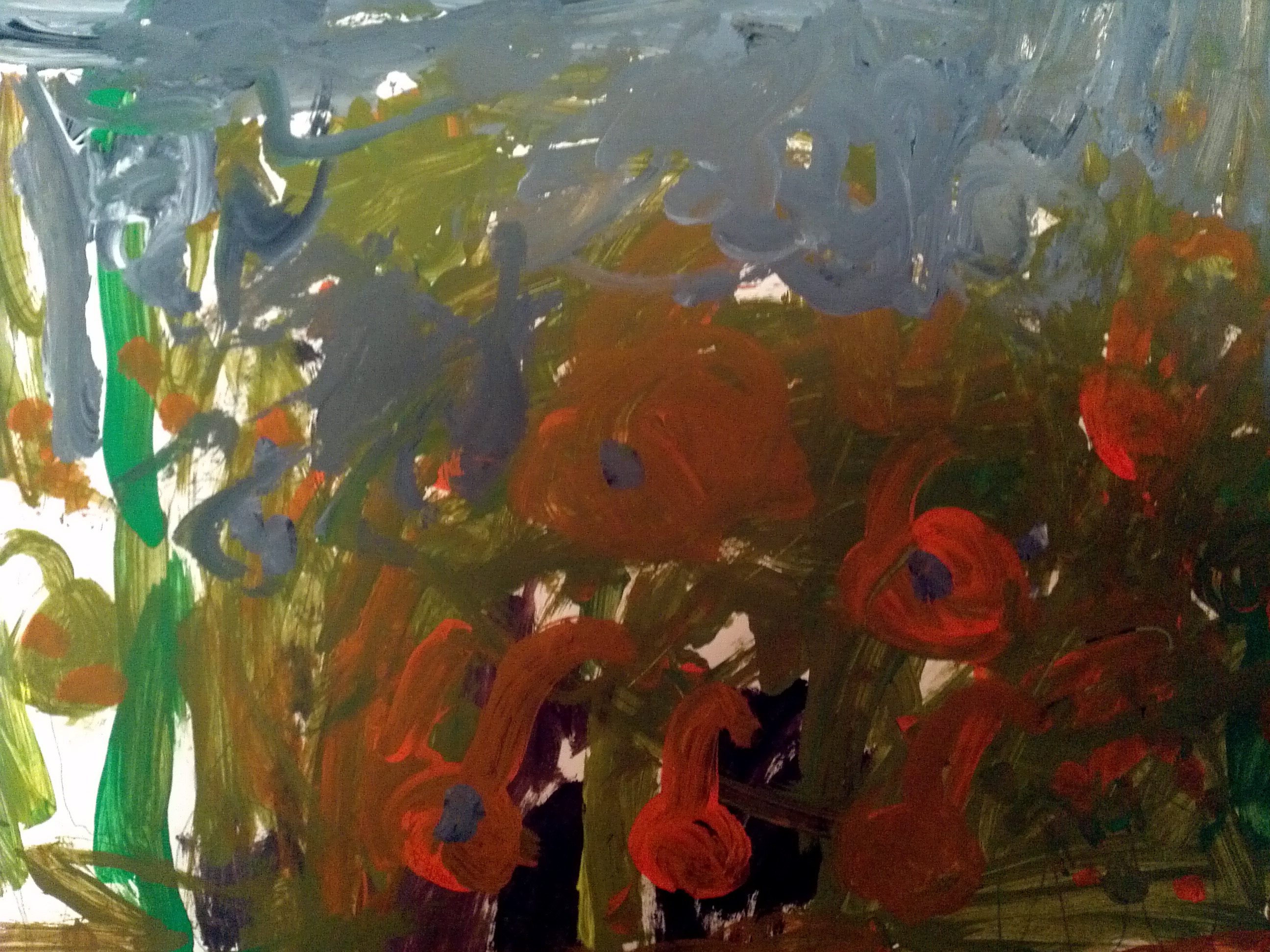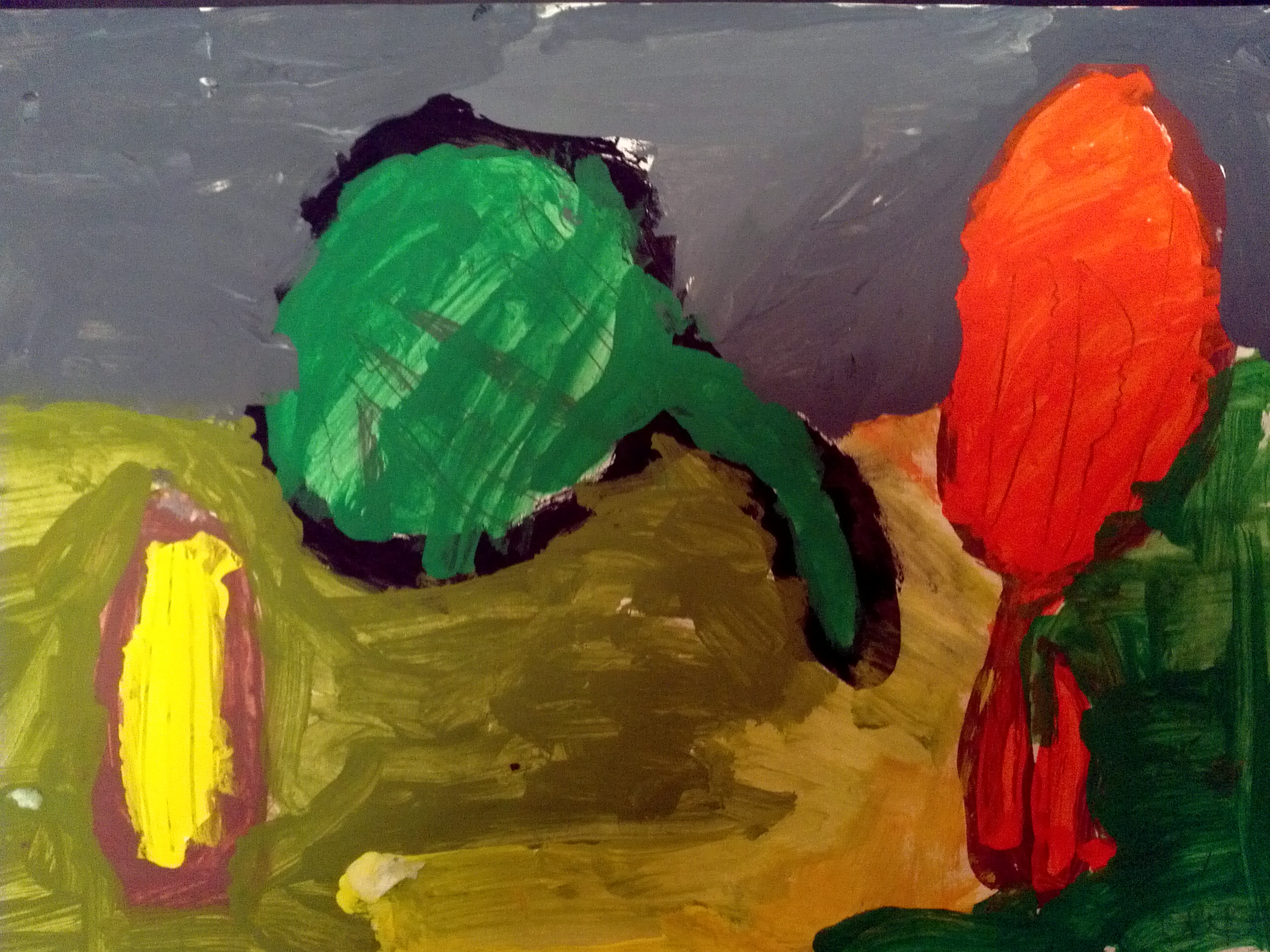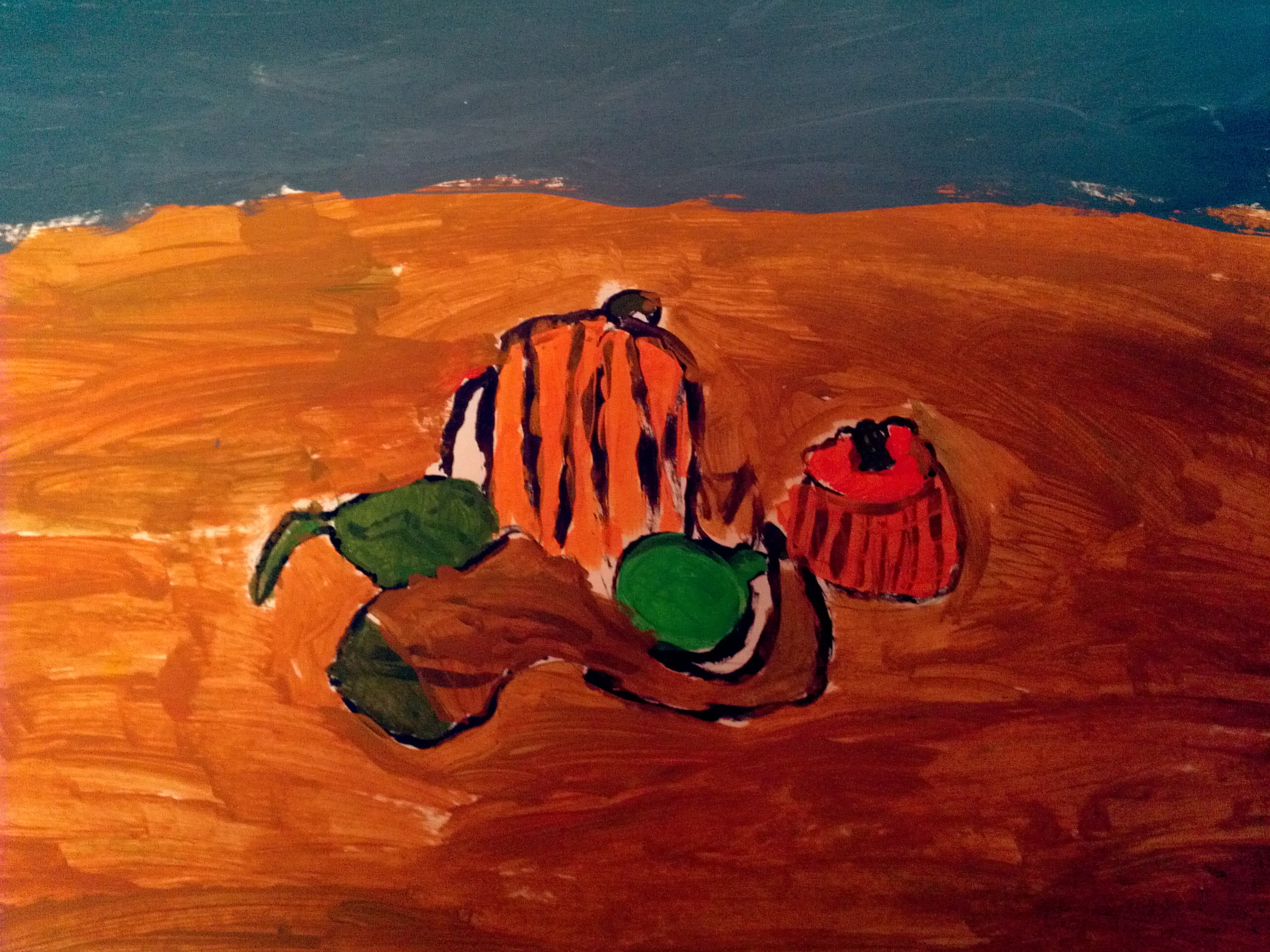 For the second class, I read more about Cezanne’s paintings. Even though he believed things should look flat, he felt they should have lots of color and details so that his subjects would feel solid. After bringing back all the pumpkins and gourds, I gave each artist orange, green, and yellow tempera paint. I wanted the pumpkins and gourds to be painted realistically and we talked about the different colors on each type. To finish the painting, we mixed all three colors to paint the table and then mixed grey from black and white for the space behind the table. I chose neutral colors so that they bright oranges, green, and yellow would stand out.