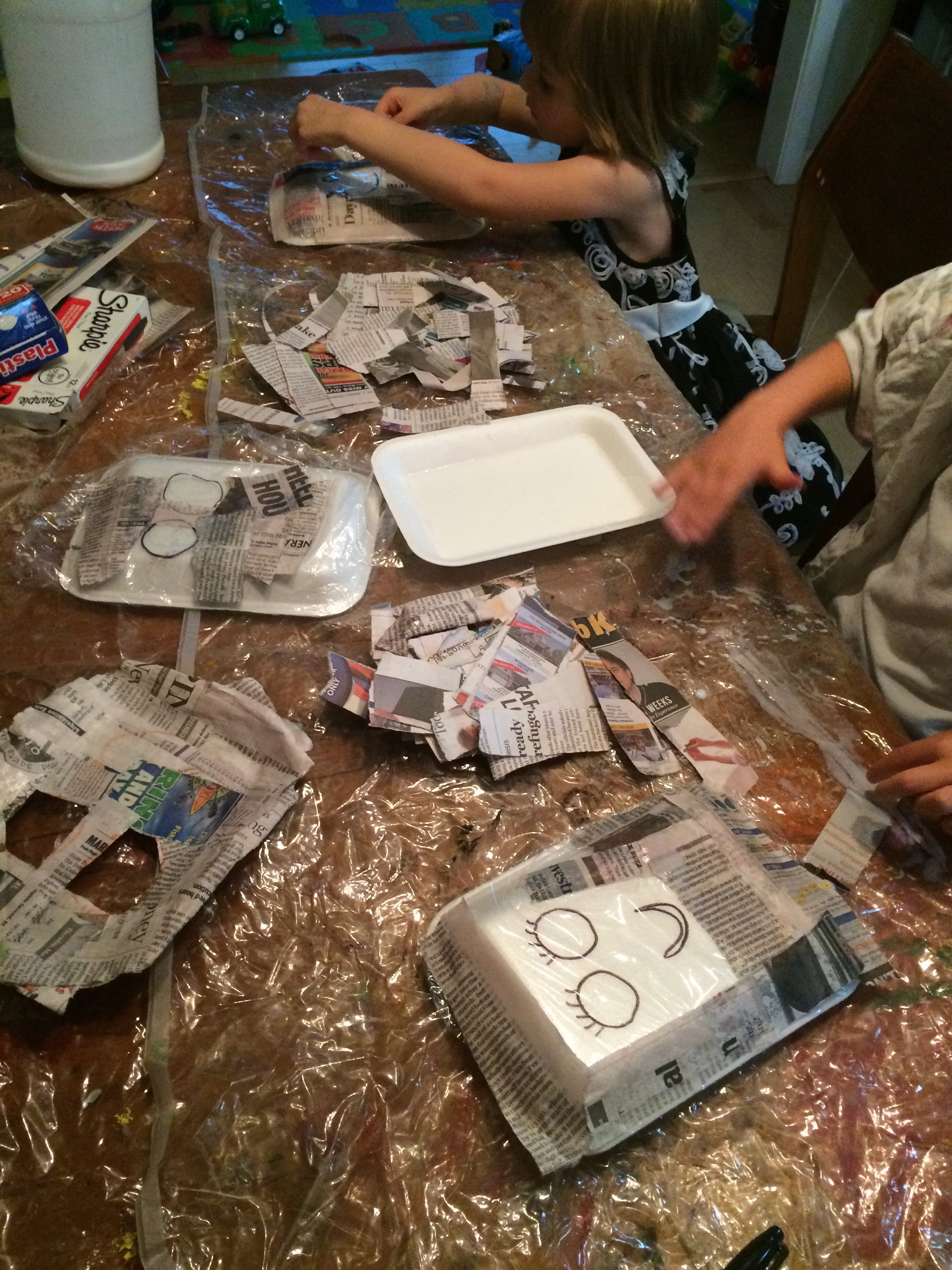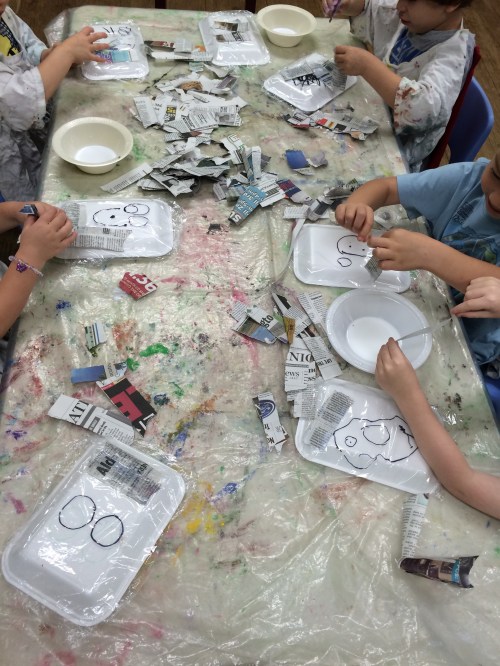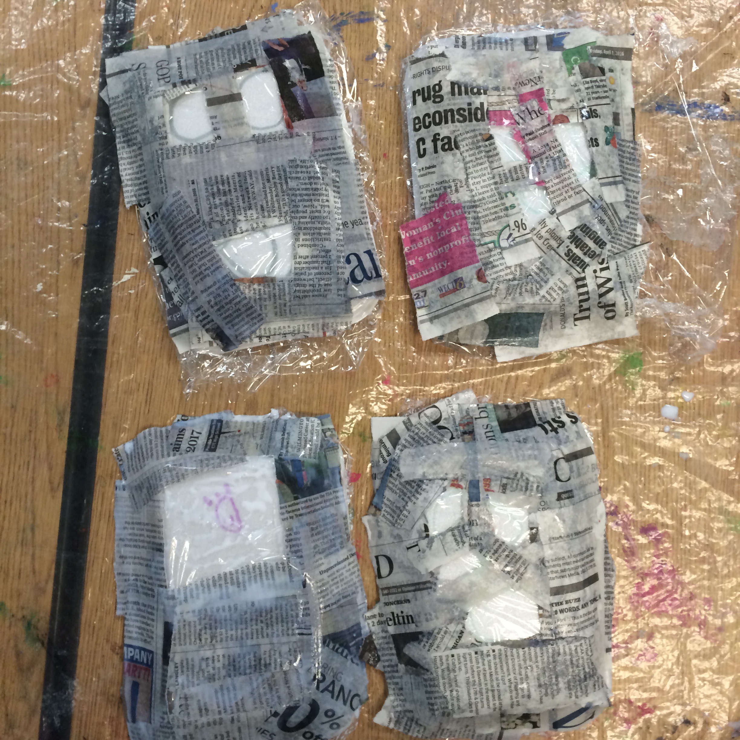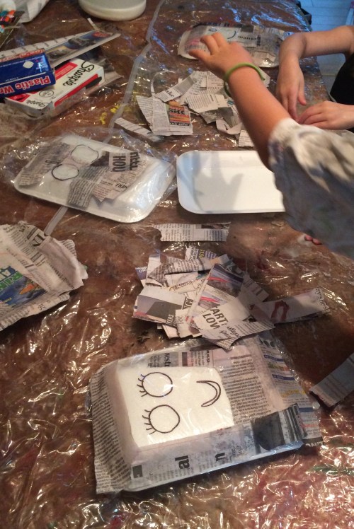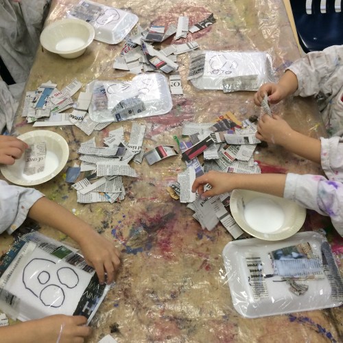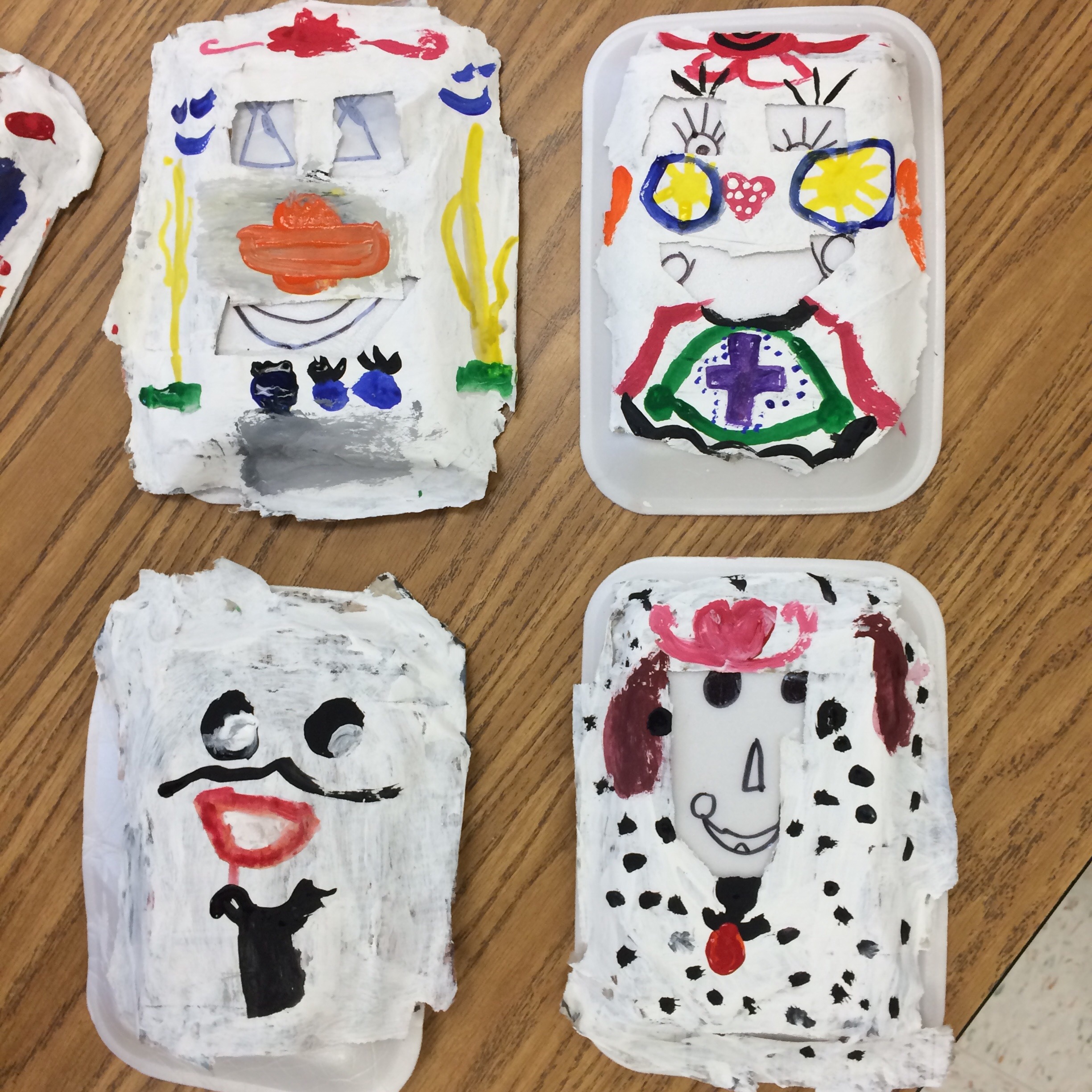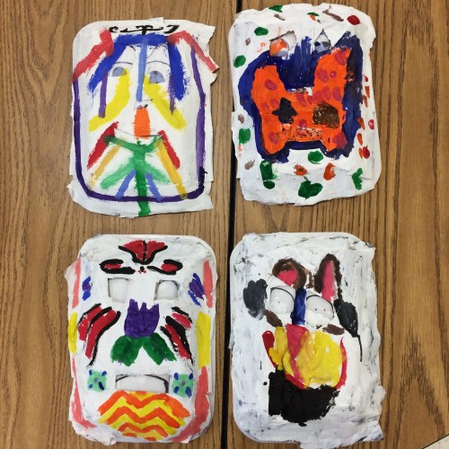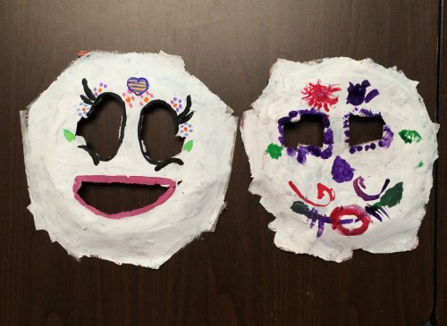 I know Day of the Dead is celebrated over November 1&2 but it was just after Cinco De Mayo that I found inspiration for our paper mâché masks this year. Every year I pick a different culture to study and the masks the make and why they are made. During the Day of the Dead, these sugar skulls are made from sugar as a way to make the celebration less scary for the children. The art on these skills use bright colors in simple shapes and lines that I thought would look fantastic on their masks. I love paper mâché but sometimes even my messiest artists won’t touch the sticky stuff while other cover their hands in it and ask for more! Here are some pics I was able to get before covering my phone with glue.