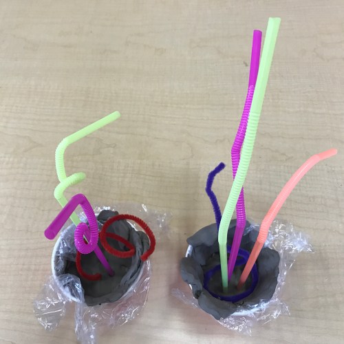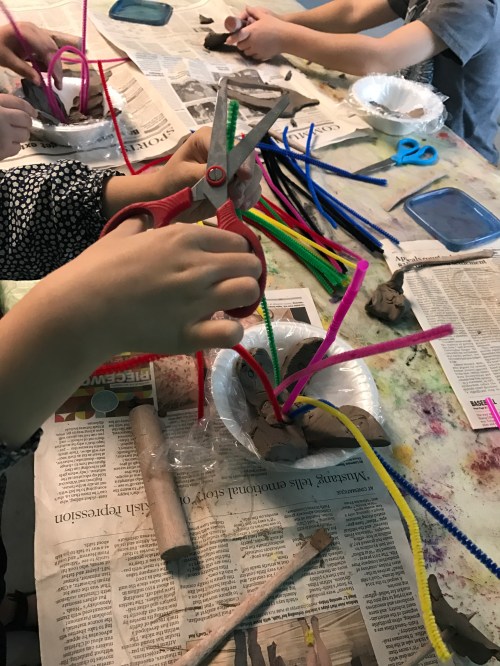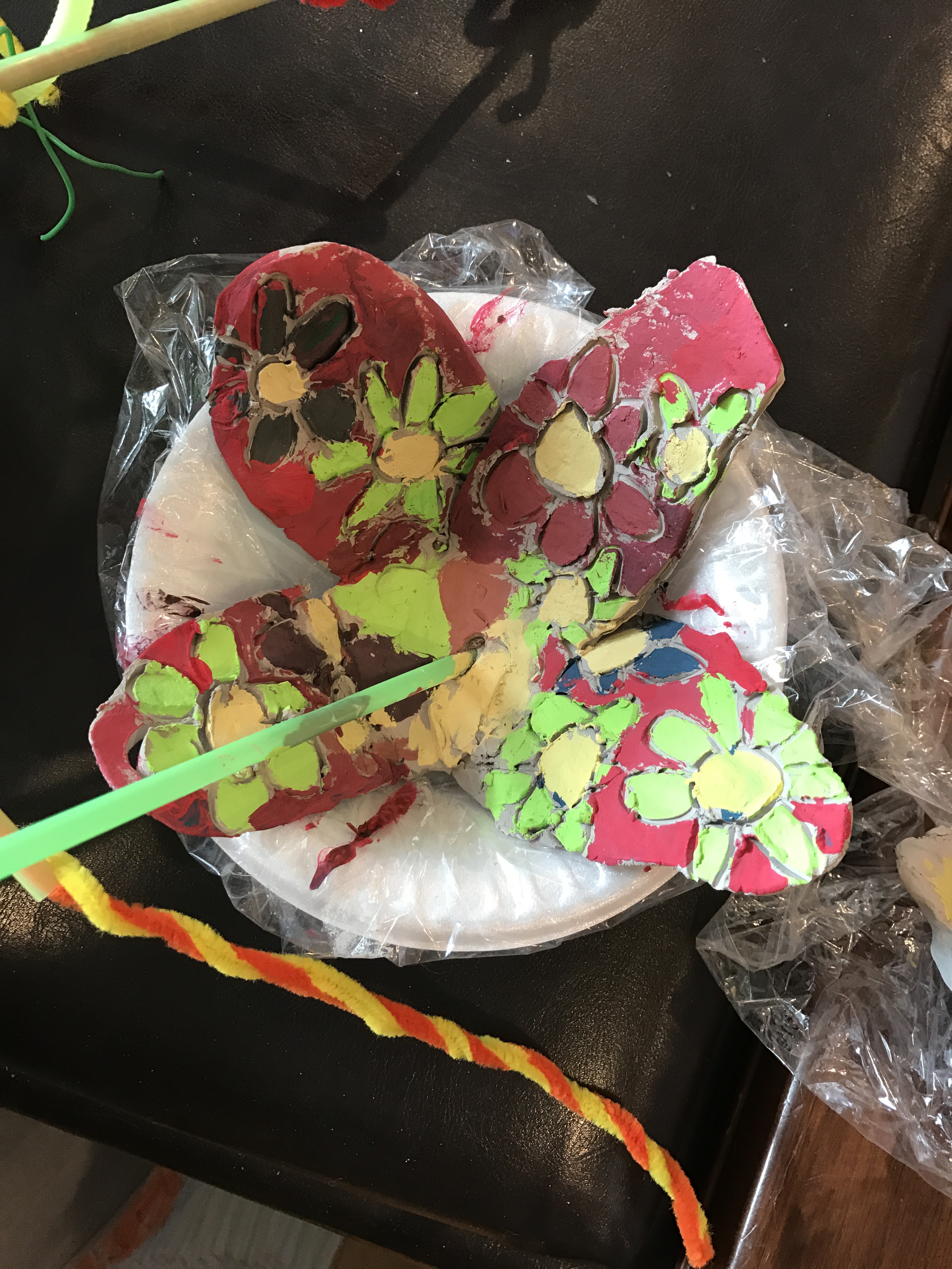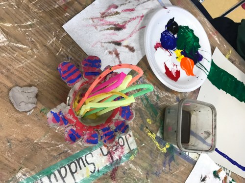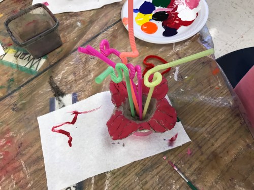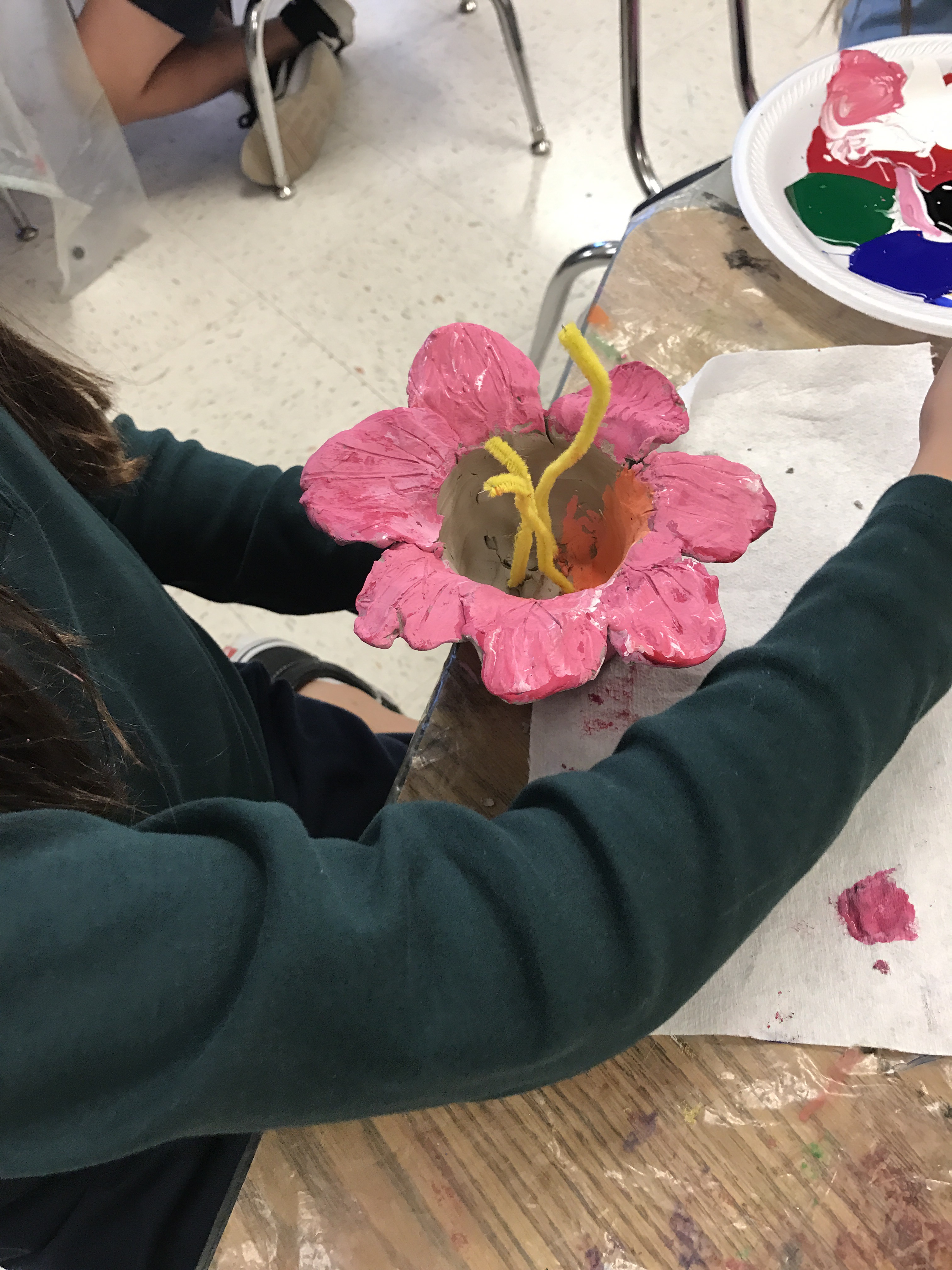 For our next venture with clay, I wanted the artists to learn how to roll pieces of clay into slabs. We took the pieces of slab and placed them into styrofoam bowls to hold the shape of the bowl while they dried. To add the final touch to our bowls before they dried, we looked at diagrams of flowers and used pipe cleaners to make stamens and pistols to rise out of the center of each flower bowl. Once the bowls were dried, we read the book Through Georgia’s Eyes and looked at many of her flower paintings. These were the inspiration for the types of flowers or the use of color while we painted our bowls.