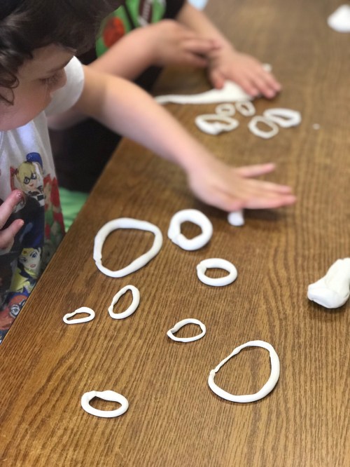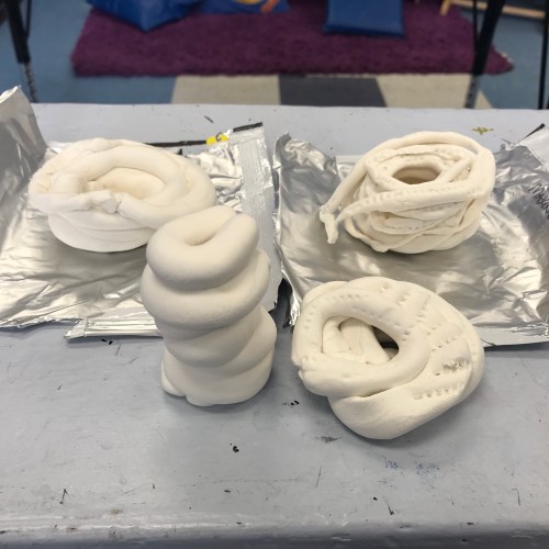 To create their pots, we separated our clay into 4 – 6 pieces. To roll those pieces into a coil, the clay is rolled using a back and forth motion. After all the pieces were rolled into coils, we connected the ends of the coils so that they created a ring. To be able to attach the coils so that they will bond together, I call this the 4 S’s: Score, apply Slip, Stick, and Smooth the line. To score clay, the surface must be roughened with small lines or dots by using any of the clay tools. Next, a thin layer of slip, a mixture of clay and water, must be rubbed onto the scored surface. This is similar to applying glue to pieces of paper for a collage and makes the bond stronger. Then the new piece of clay is gently stuck onto the scored and slipped area of the slab. The final step is to smooth the line left between the two pieces by rubbing the clay back and forth or up and down so that it looks as though the clay was always one piece. My younger classes used Model Magic again so I had them practice scoring the tops of each ring since Model Magic is engineered to stick to itself. The final step is to blend the coils together to finish the bond started with scoring and applying slip.