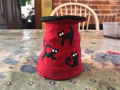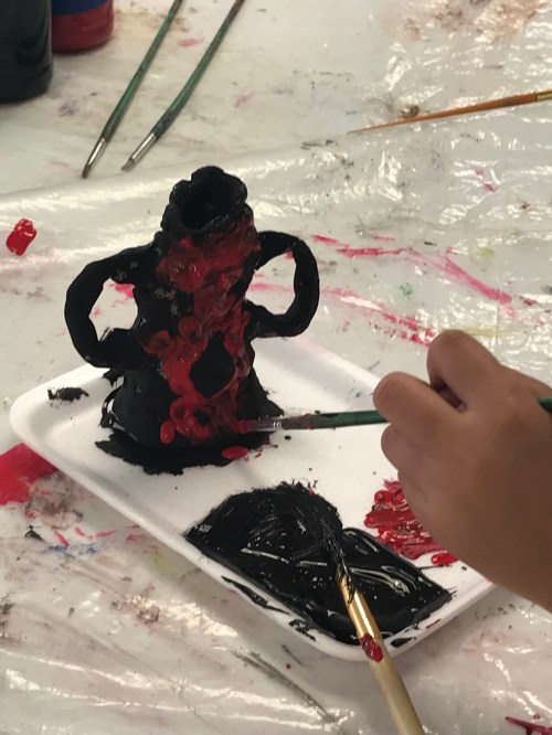 During the second class, we talked about the 3 era’s of Ancient Greek Pottery and the images or designs associated with each era. The oldest Era is the Geometric era from around 1000 BC. These pots used a variety of patterns using different lines and geometric shapes. Any people or animals were very angular and stiff. During the Black Figure Era, around 700 BC, Greek potters painted in more detail Greek people, animals, or Greek Gods. They illustrate daily life, funerals, families, or wartime battles. Greek artisans used repetitive decorations on the tops and bottoms of the vases. Most often, the top pattern uses more organic shapes that may look like leaves or flowers. The bottom pattern would be more geometric, with triangles or angled lines. The final Era was known as the Red Figure Era, when black glaze was painted around the main subject and black lines were used for more detail. The subjects stayed the same in this era as the Black Figure Era. I asked potters to paint one type of Era on their own pots. Most chose the Geometric Era and made black and red patterns on their pots. They were given only black and red paint since red clay was used to build the pots and the only glaze available was black to the Ancient Greeks during that time.