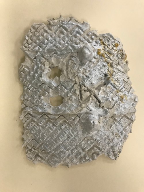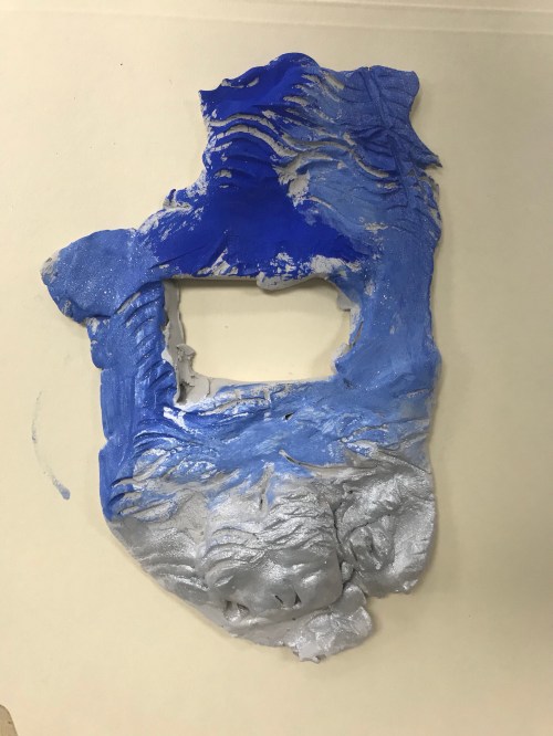 In clay, when part of a sculpture is partially or completely removed, it becomes subtractive. This can create negative space when it is completely removed. Artists were able to choose what they wanted to remove and mouths were very popular for being cut all the way out. The final step during the first class was to add the removed clay back onto the slab. When air-dry clay is reconnected, there is a four-step process called the 4 S’s to make that bond stronger: Scoring, applying Slip, Sticking, and Smoothing. To Score clay, tiny holes, marks, or scratches are made into the surface where a new piece is to be attached. Next, a thin layer of Slip (water or clay-water) must be rubbed over the area. This acts like a glue and makes the clay slippery. After the slip is applied, the new piece of clay can be Stuck on top of the slip, and finally the outer edges must be Smoothed together to seal the bond. This was a new technique for my classes that made their coil pots out of Model Magic. The pieces that stood out from the slab are known as additive space because they were added and rise above the original slab of clay.
