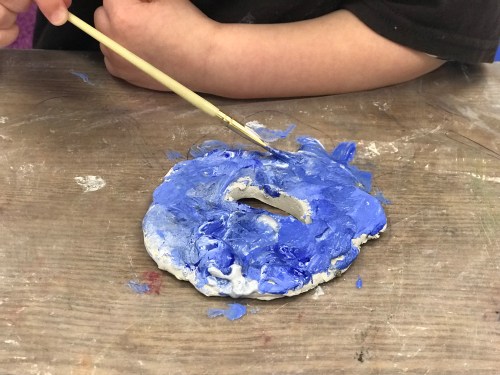 Our third clay project drew inspiration from the moon since the artists would be learning about Negative Space. This project would be teaching the artists to create a slab sculpture that would also have additive space. We first used rollers to roll the air dry clay flat but could be in any shape the artist desired. Next, we used textured rollers to create our own versions to the craters found on the moon’s surface. Finally, we drew faces to create our own Man in the Moon. Once the faces were drawn, artists cut out the mouth that they drew. Older artists were allowed to cut out more parts of their face. By completely removing the clay, they created Negative Space. It’s easier to see this concept with clay since the artists can now look completely through their slab sculpture.