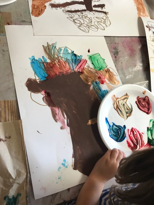 We started off the year with a video titled “Trees” by Educational Videos for Kids. It’s an awesome video that uses an animated Earth to talk about why trees are so important, from their roots holding ground together, photosynthesis with carbon dioxide and oxygen, to how trees help filter the air and control the climate. Then, we pulled out a dry erase board and started talking about the 3 main types of lines, Straight (a line that continues to move only in one direction), Curve (a wondering, circling line), and Zig Zag (the line who stops on a point and then changes direction). We took turn drawing lines before starting to draw our trees. I encouraged the artists to think about the different lines and use them to create their trees. As we began our drawing, we talked about the life cycle of a tree, parts of a tree, and what a tree needs to grow from a tiny seed. After they were finished drawing, I passed around brown paint and they began to outline or fill in their trees with brown paint. At the end of the class, I began to readsome of Klimt and His Cat by Shannon White.