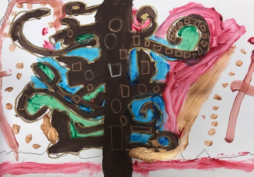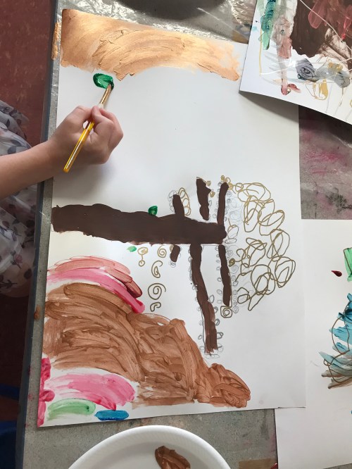 Since many of Klimt’s paintings included gold paint, I gave the students gold, bronze, and silver metallic sharpies to draw repeating geometric shapes on their trees or in the background. They could also continue drawing the different types of lines on the trees or backgrounds too. After they finished drawing, I gave out gold metallic paint and red, blue, and green glitter paint. I urged all artists to paint in their shapes and add as much color to their paintings as possible.