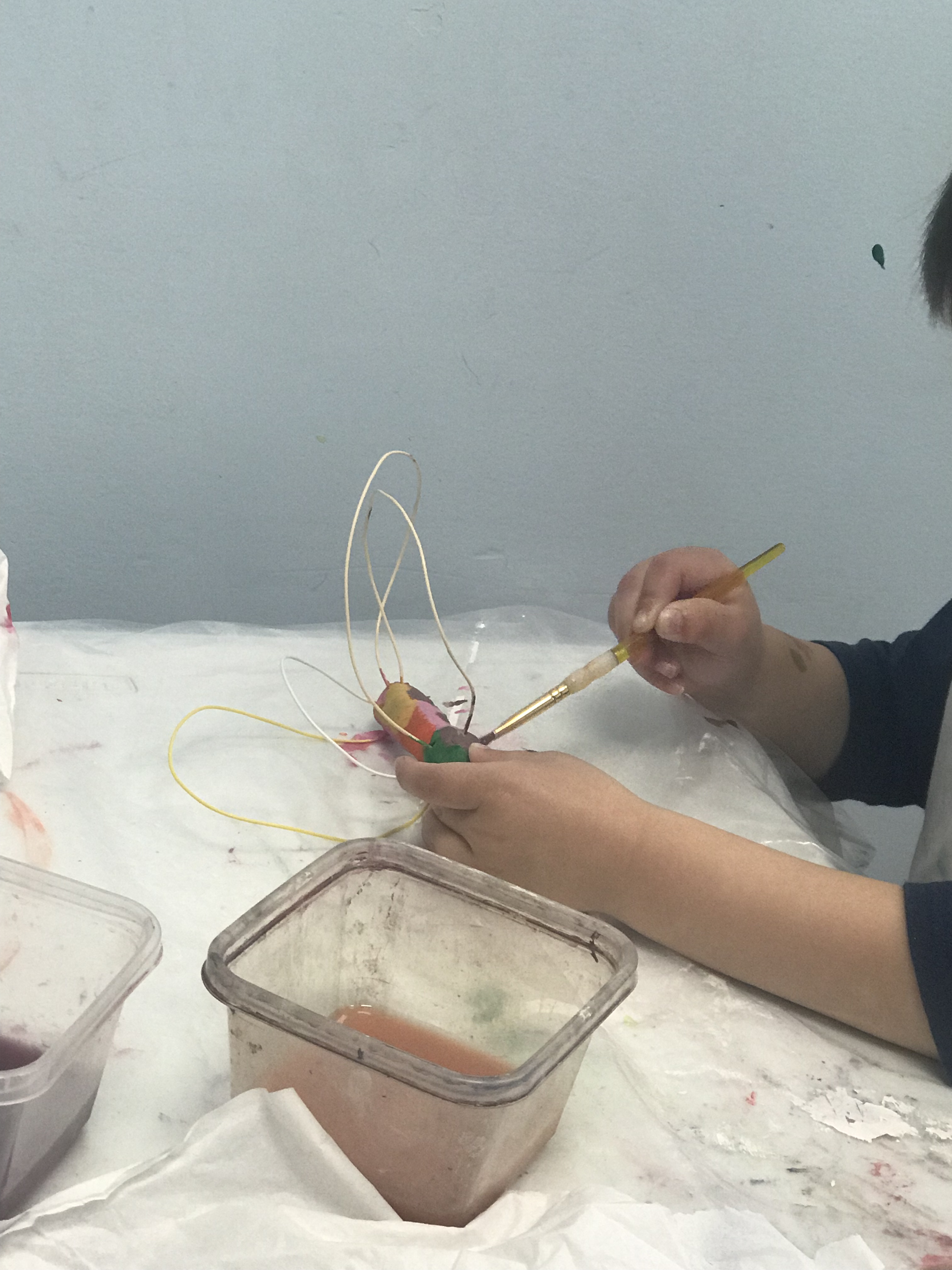 To begin the second class, I read the National Geographic Book for Kids on Butterflies. After the clay was dried during the week, we painted the bodies of the butterflies. The sculptors were given a rainbow of colors and could paint them any color they liked. This clay absorbs the paint much quicker than Model Magic so it gave the artists the ability to layer colors and patterns without mixing layers of paint.