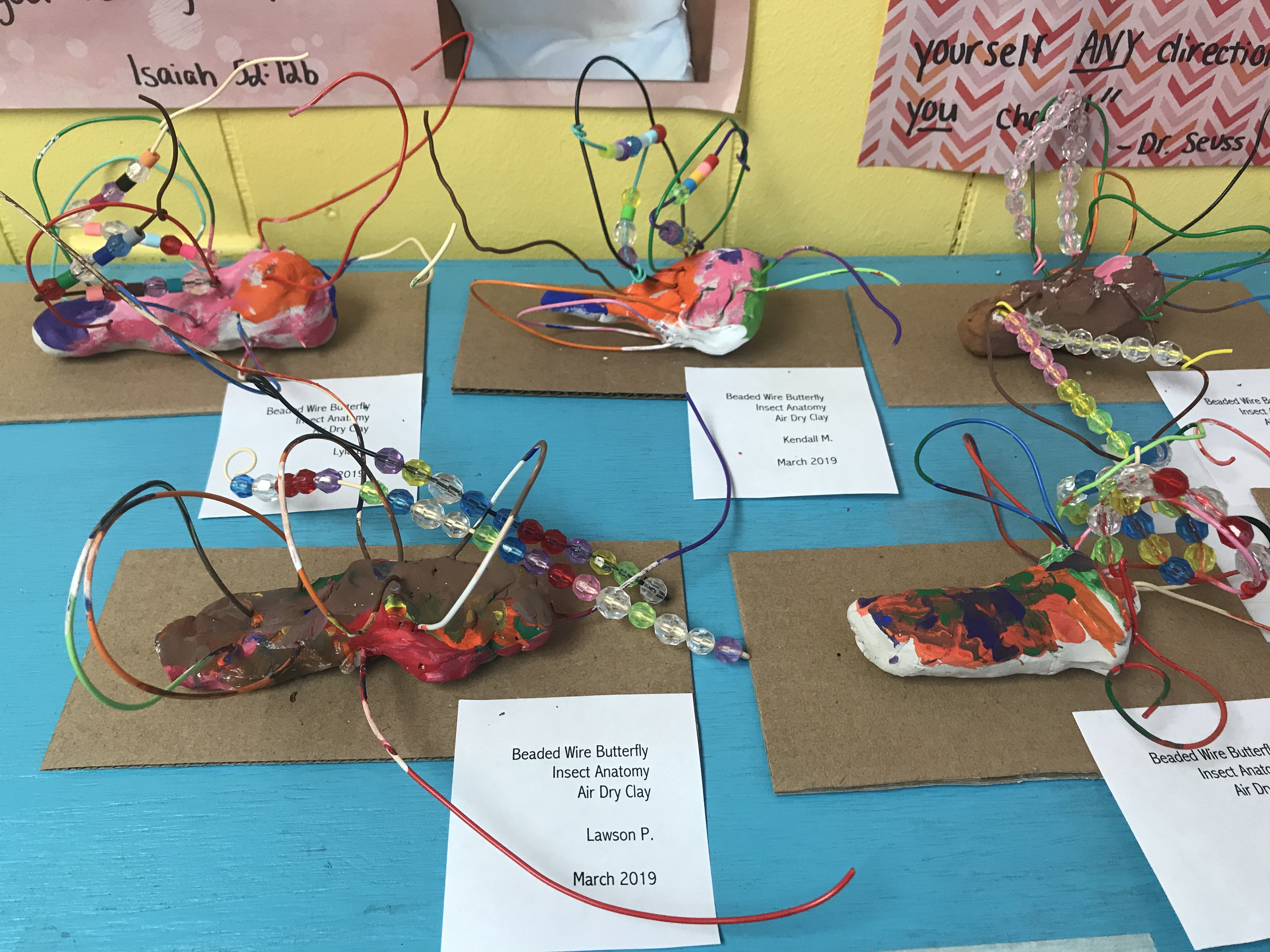 This project was the first time that all my sculptors would be working in muddy clay. I chose a butterfly for our subject since we’ve finally entered the spring season! I began the first class by showing a video from Sci Show Kids: How a Caterpillar becomes a Butterfly. There are 4 steps from egg to butterfly. These are Egg, Caterpillar or Larva, Pupa (while in the chrysalis), and finally Butterfly. This became a perfect tie in to learning the 4 S’s process to allow the muddy clay to bind together. We used air-dry clay to sculpt 3 round shapes for the head, thorax, and the abdomen. Next came the 4 S’s process for attaching each piece together. First, Scoring the clay by creating tiny dots on the surface of the head, thorax, and abdomen. The Second step is applying Slip, a fingertip of water to the scored area. Third is Sticking by pressing the clay together. Fourth is to Smooth the two pieces of clay together. Next, the sculptors were given Twisteeze wire to make the wings. We looked on the diagram to see that some butterflies have forewings and hind wings. We bent the wire into the shape of the 4 wings. Some sculptors even added the 6 legs, antennae’s, and proboscis.