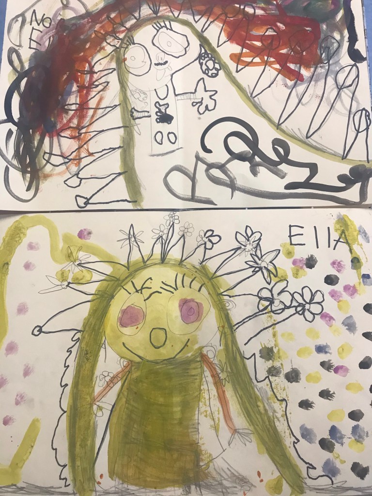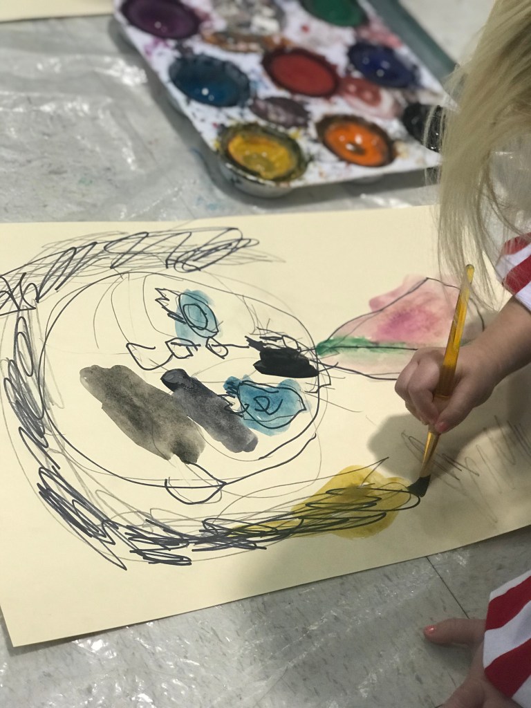 This is the time of year when I have all my artists create their self-portraits. This is the only project that I teach every year because you not only see how your artist portrays themselves, but their cognitive and fine motor growth. For the first part of the project, we drew a shape for our head and added 2 guidelines, one horizontal and one vertical that intersect in the middle of the face. This divides our face into 4 parts (top/bottom, left/right). This helps the artists to know where the placements of their facial features are. As we drew our faces, it became a wonderful time to learn about, or review, the five senses. I like to start with the sense of sight. The eyes sit on the horizontal line half way from the top of the head to the chin. Next we add the iris, pupil, eyelashes, and eyebrows. Then it is on to the sense of smell. The nose is placed right on the vertical line below the eyes. Noses are great to draw because they come in so many shapes and sizes. Next, is the sense of taste. I always ask artists to draw a smile. It’s their choice to add lips, teeth, or just a closed smile. After we complete the mouth, we move to the sense of hearing. The ears are actually located between the eyebrows and the nose. Finally, we added hair on our heads. If there was room, some students added bodies and the final sense of touch with their hands. We finished our drawings by tracing over with black paint or black sharpies.
