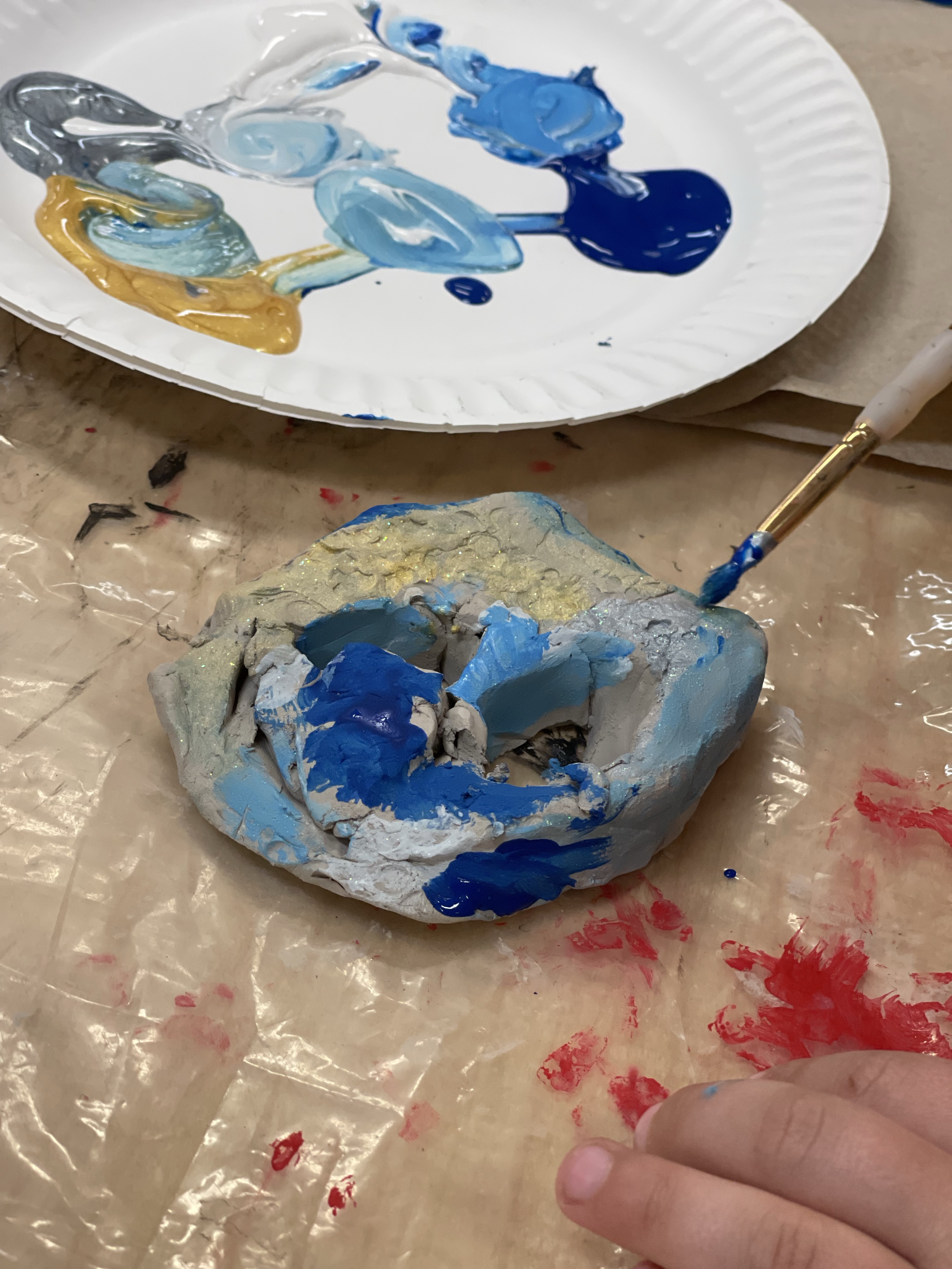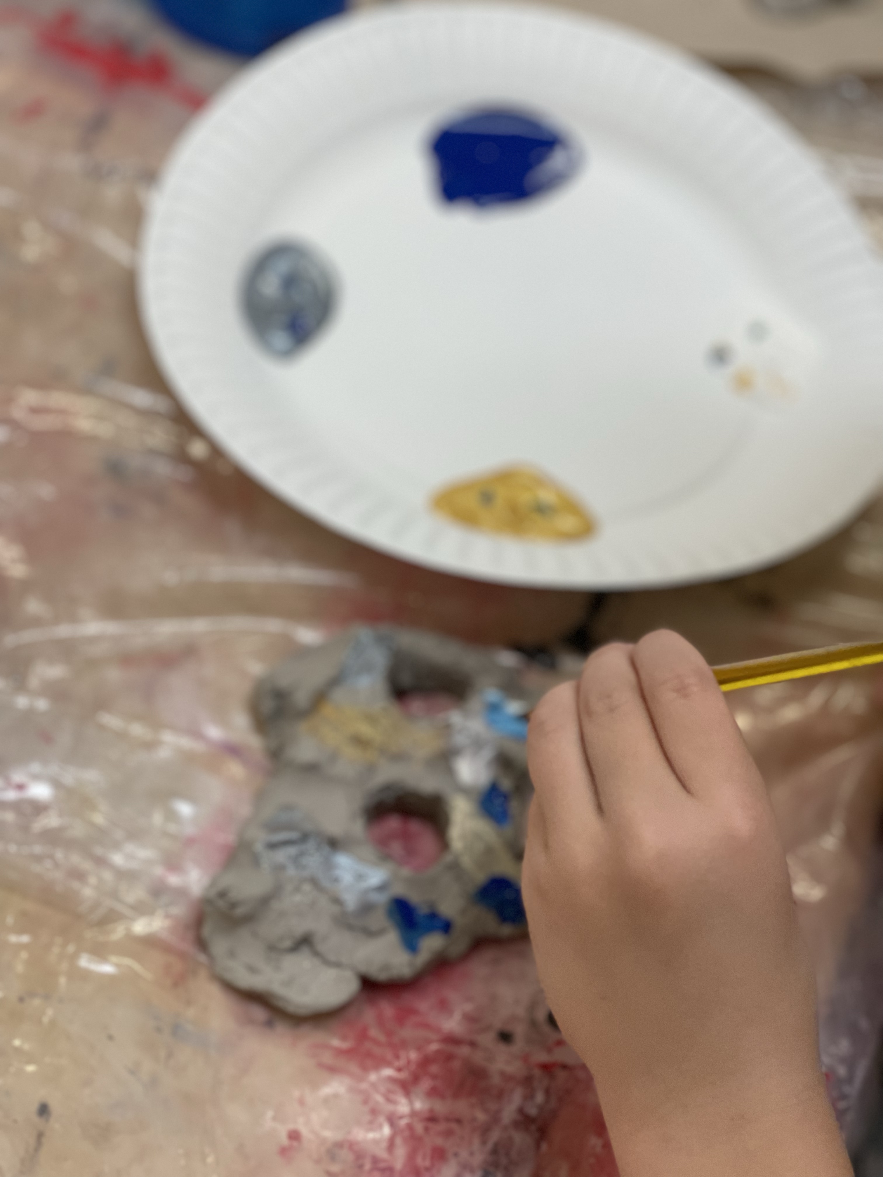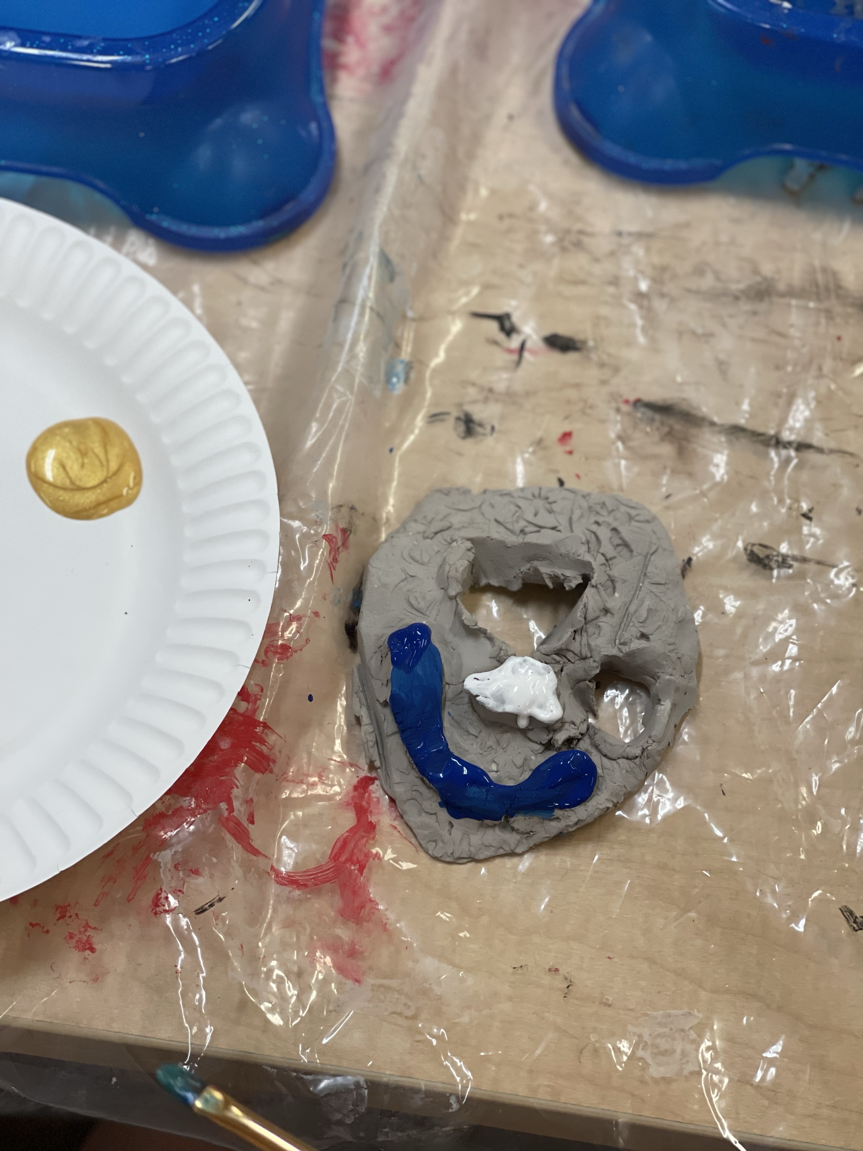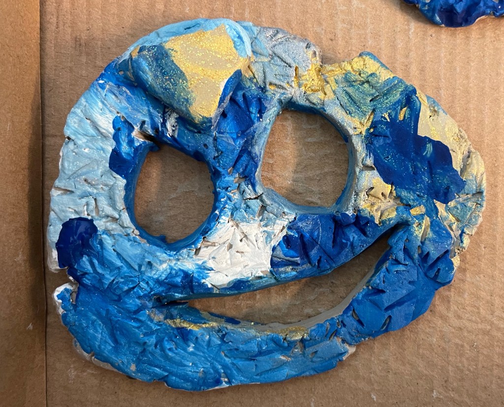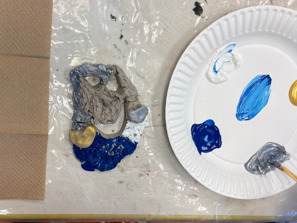 The artists learned how to roll the clay into a wide, flat slab. Then they used texture rollers to create craters on the surface. Next, the artists used tools to cut out a face to create negative space. Finally, the artists used the 4 S’s to add the clay back to give the sculpture an aspect of low relief. Finally they were given blue, white, silver and gold to paint their moon face.