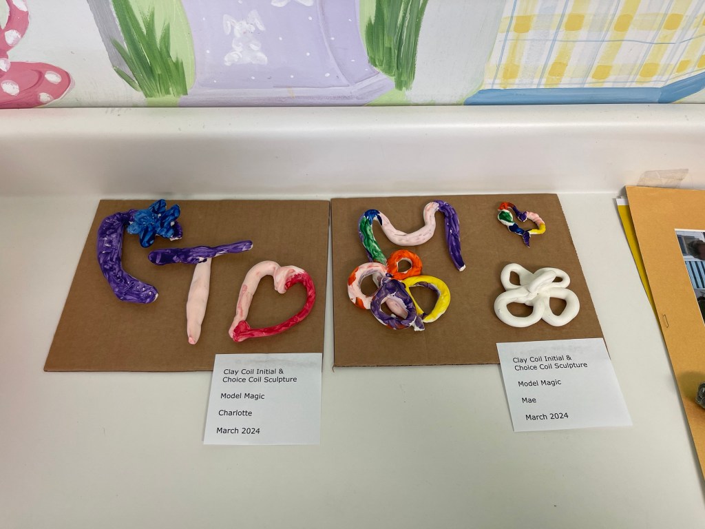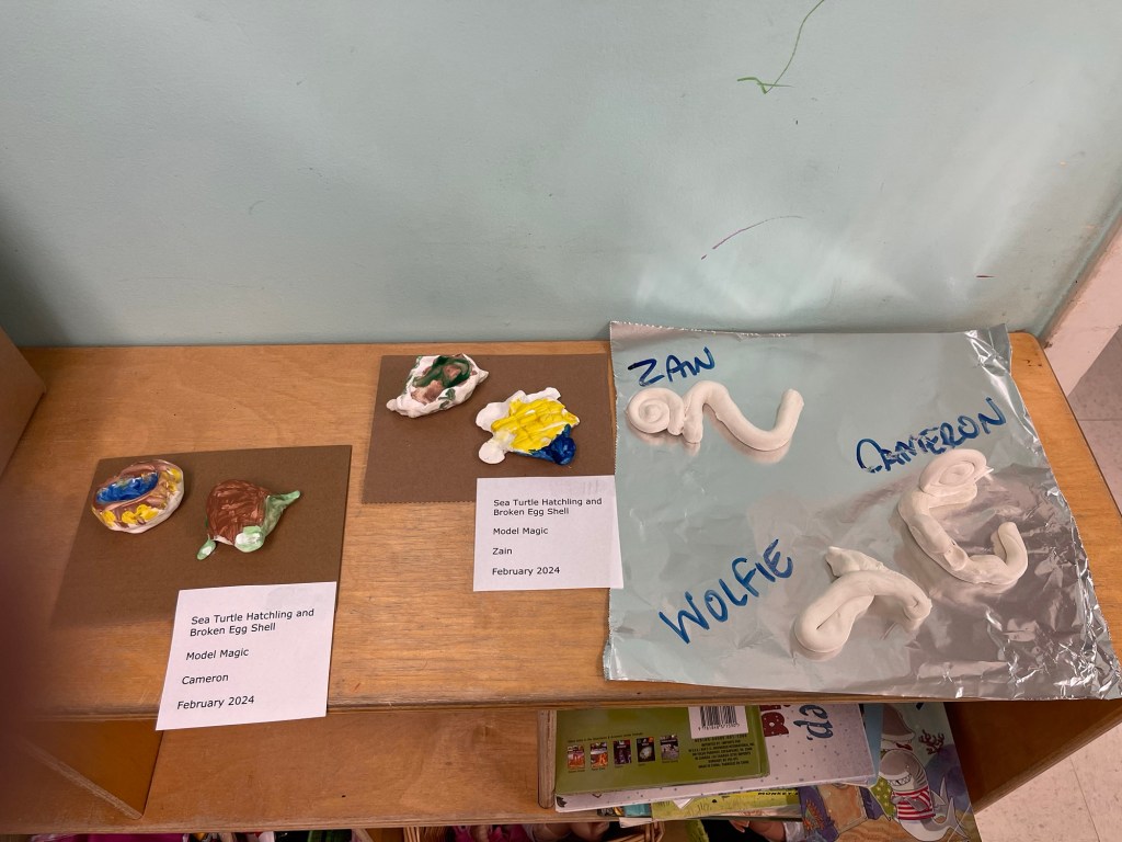 We began working in Model Magic during the last half of our session. The sculptors began by making sea turtle hatchlings and their eggs. They were shown a pinch pot method of pinching and pulling the clay to make their eggs and sea turtles. Next, they learned about rolling coils, long cylindrical shapes, they bent and twisted into letters for their names.